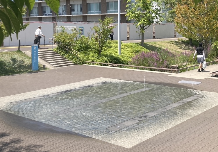 水道水を使い、さらには裸足でも安心なようフラットな地面に整備されていて、夏は水遊び場としても人気のスポットです。