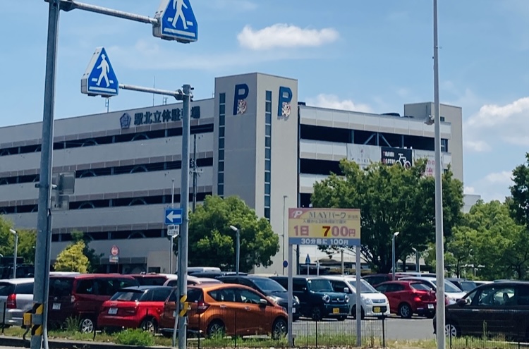 広場そばのバスロータリーを東に歩くと現れる、市営駐車場「駅北立体駐車場」の出入り口。