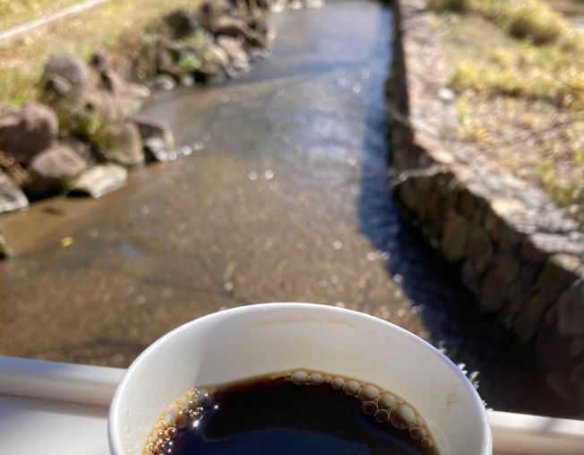 せせらぎを見下ろしながら、のんびりカフェタイム。…なんともチルな時間です。