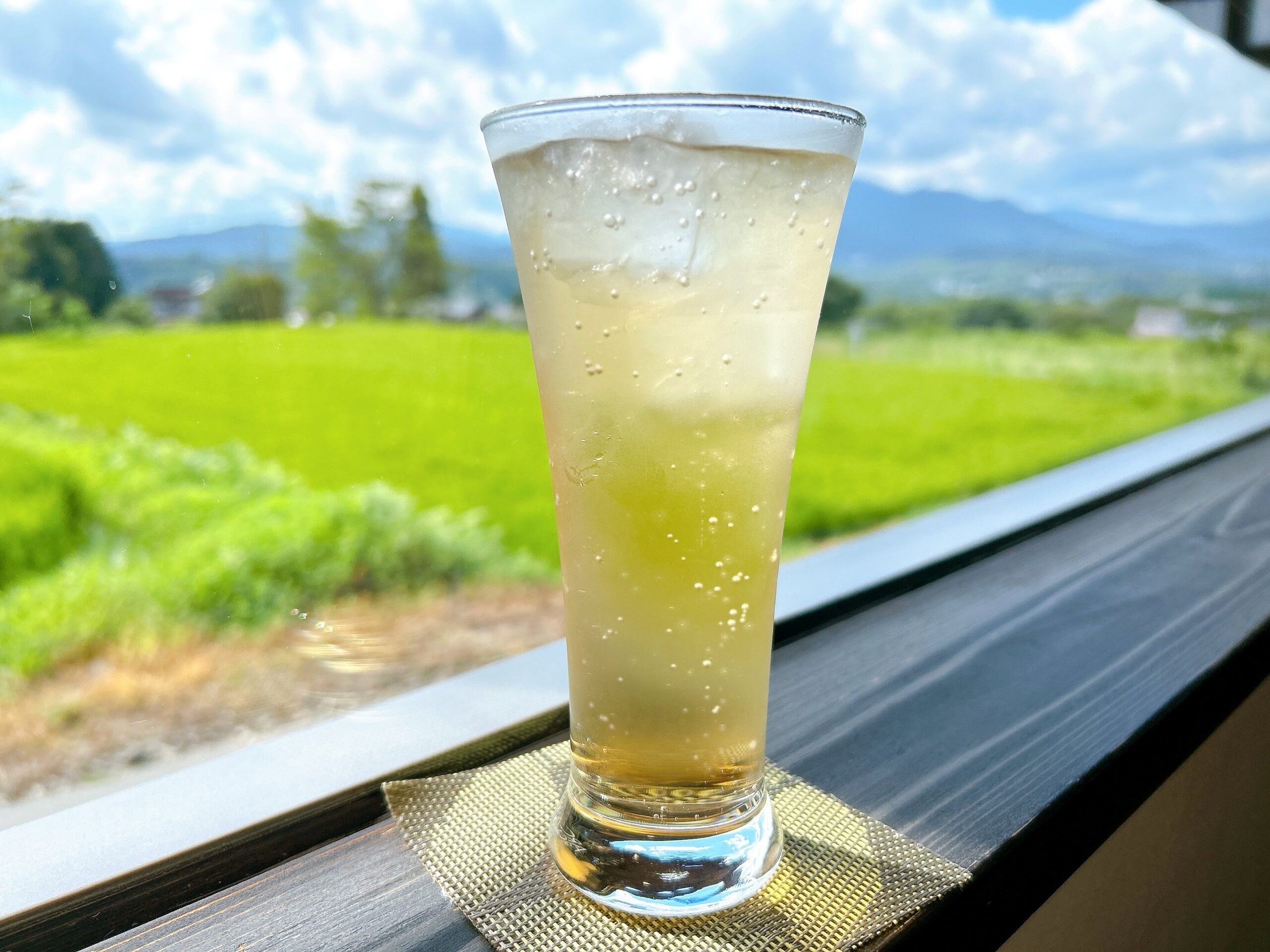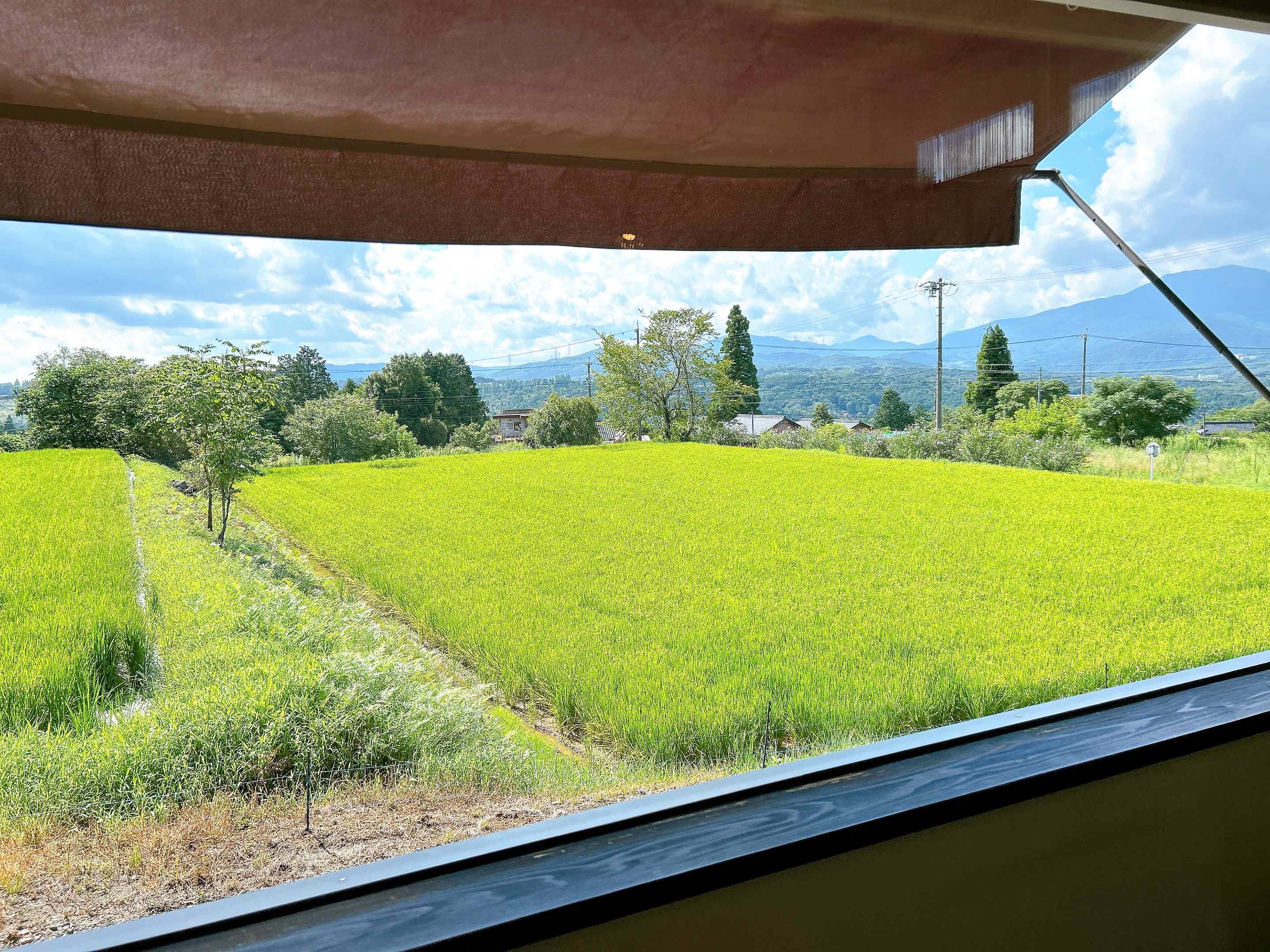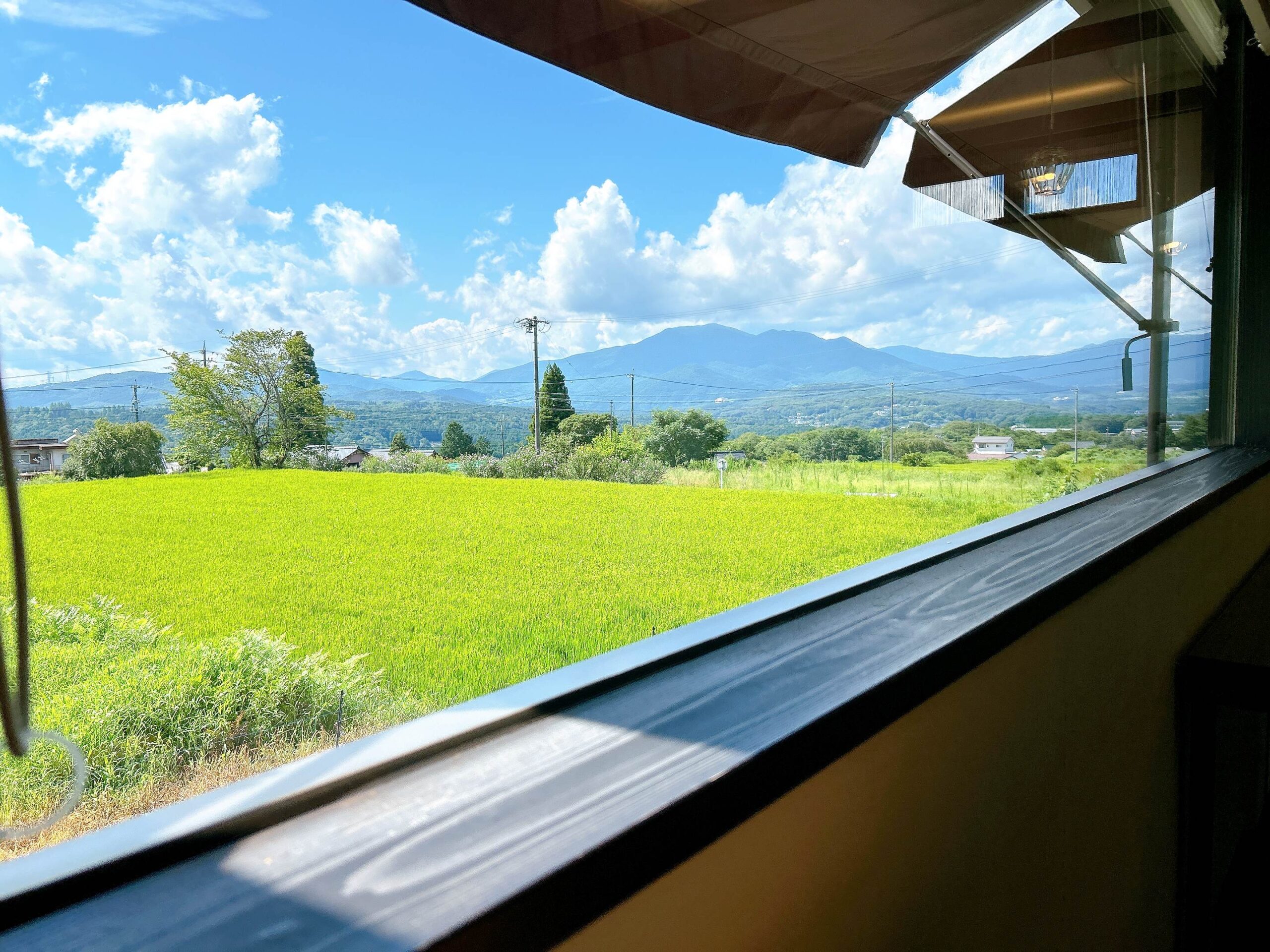 伺った日は雨上がりの午後。水田の緑が鮮やかで、稲に残った雨粒が日差しでキラキラと輝いて見えます。空の青、雲の白。窓は開かないのに、心地よい風が感じられるような景色です。