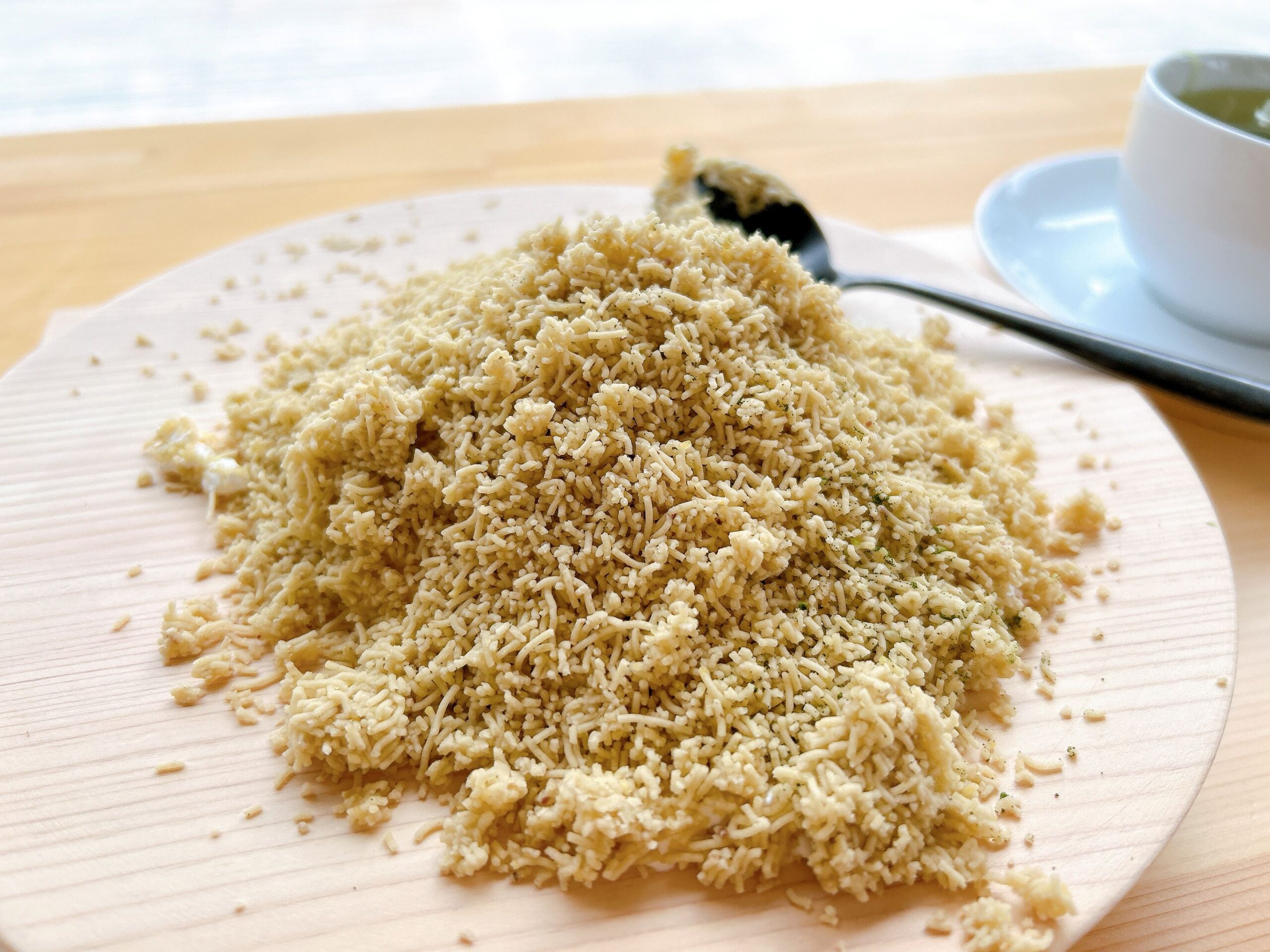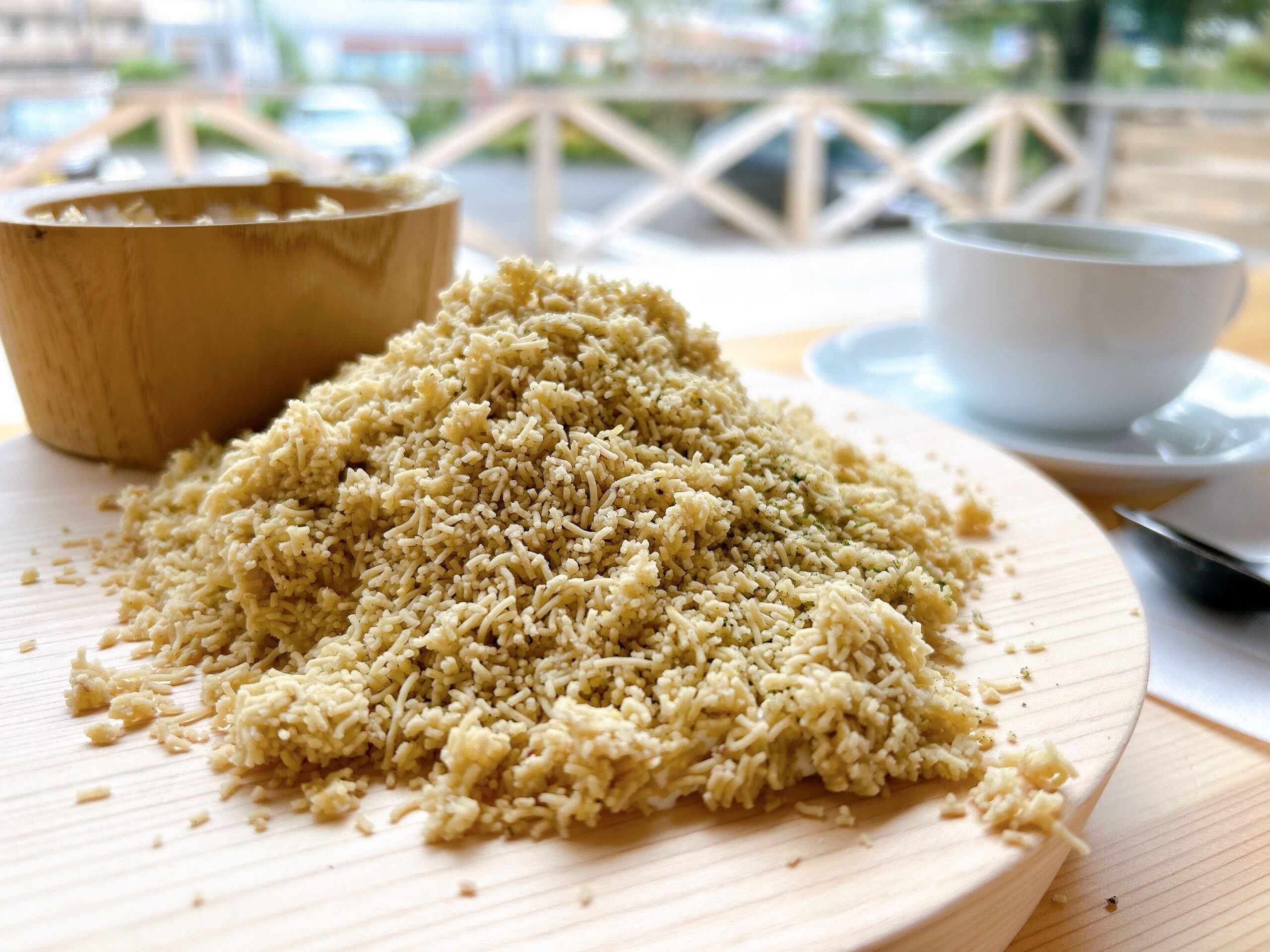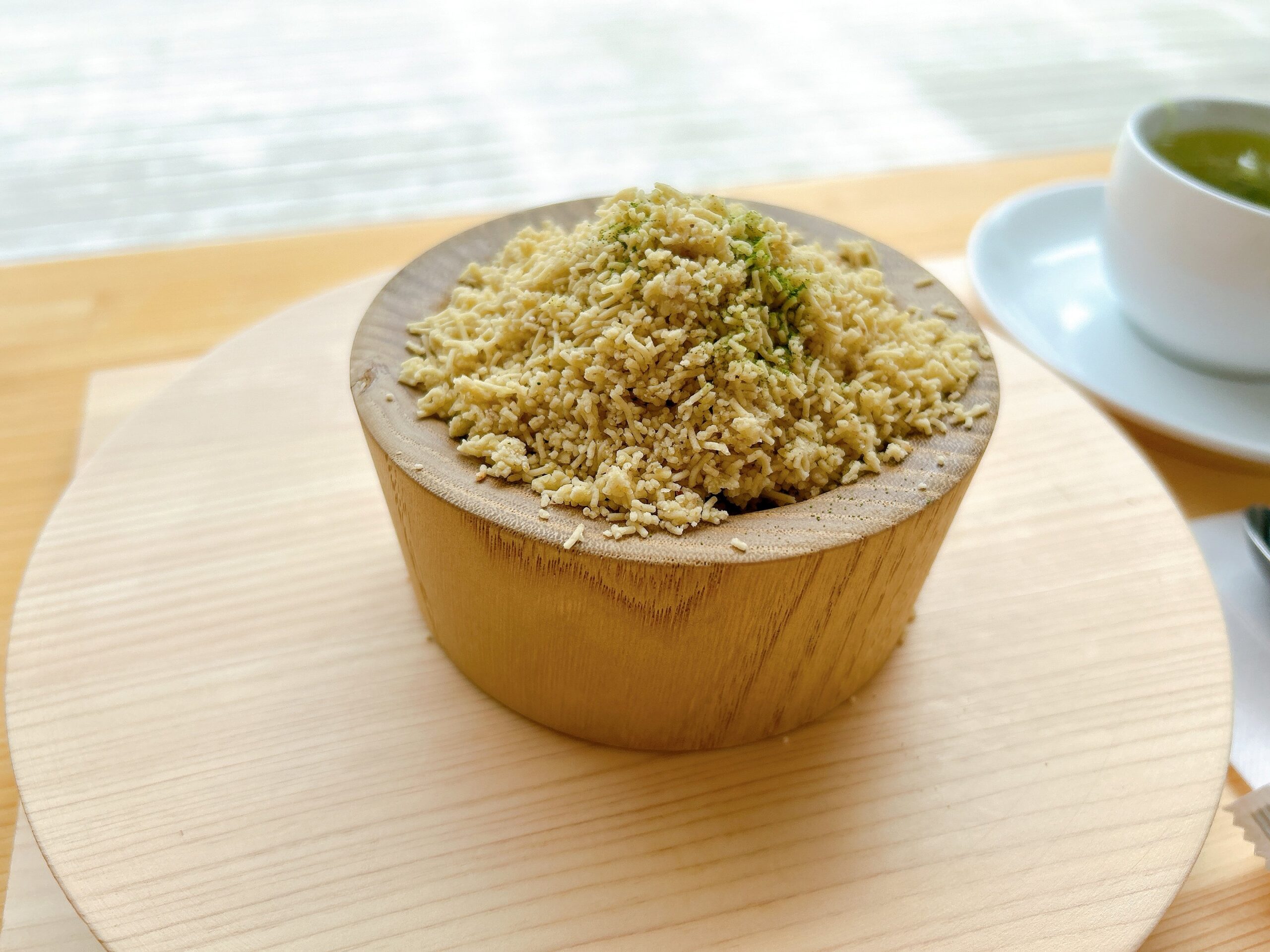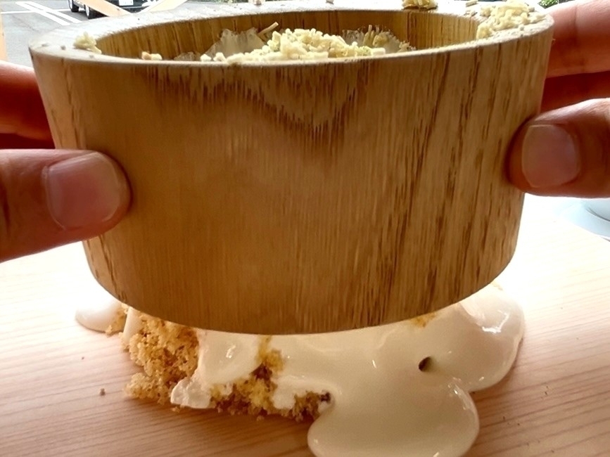 フレーク状のスポンジ、やさしい甘さのクリーム、栗の風味をしっかり感じられる栗粉もたっぷり。木枠のなかでは3層になっているようですが、木皿いっぱいに広がることで一体となり、モンブランが完成!