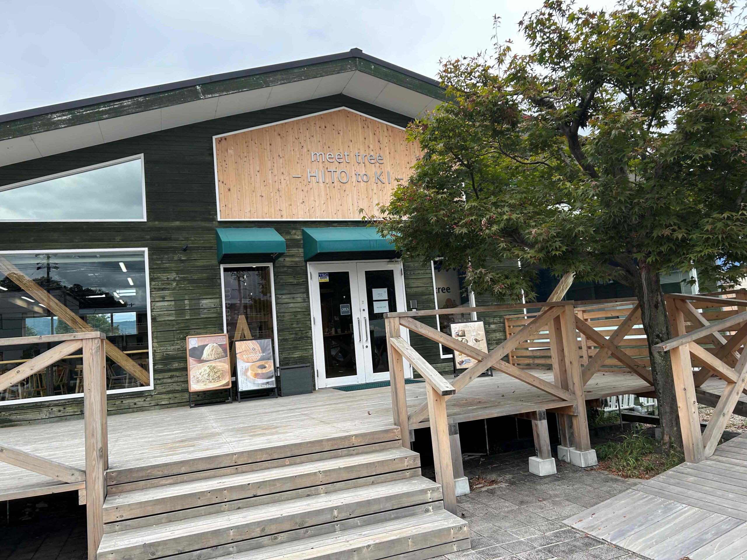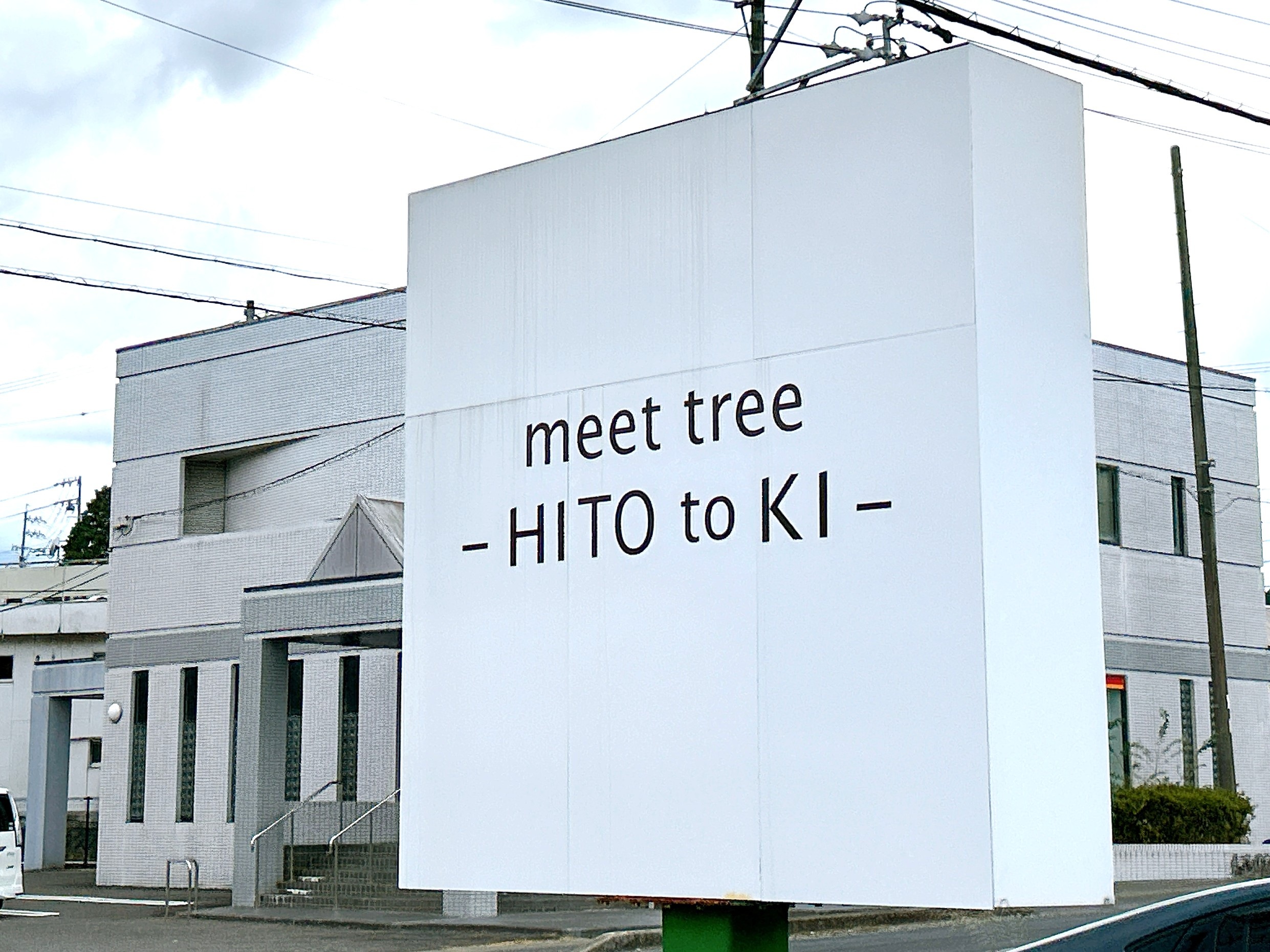 「meet tree HITO to KI(ミート トゥリー ヒトトキ)」さん。白地に店名のみが記載された看板はシンプルでスタイリッシュな感じがします。