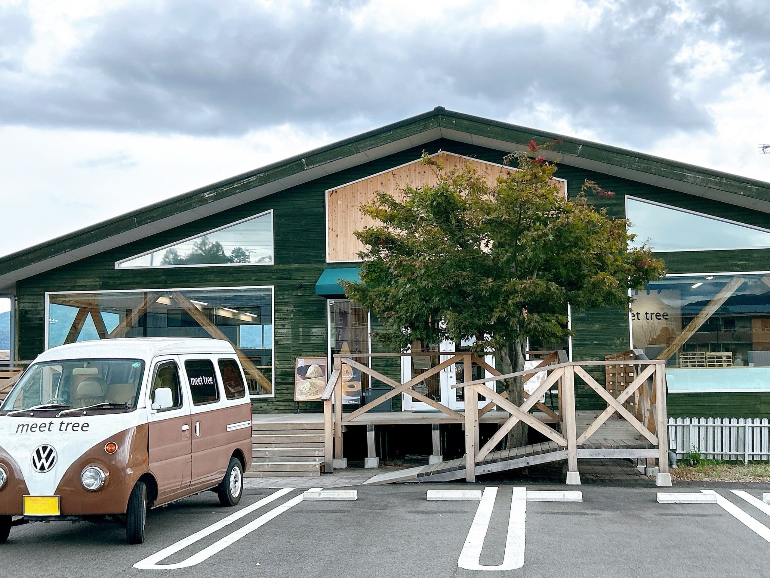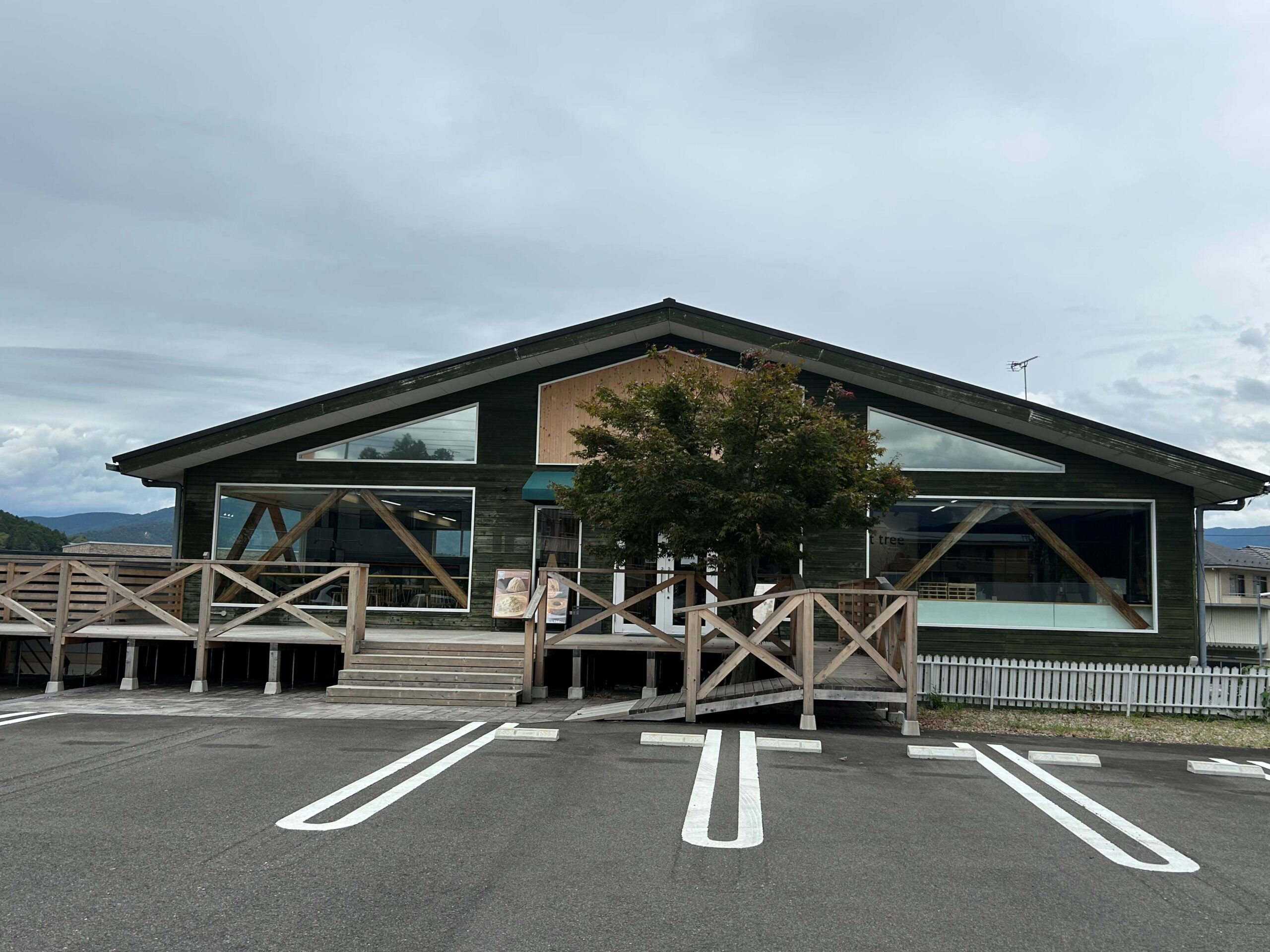 ダークグリーンに塗装された板張りの壁にウッドデッキ、階段やスロープなども木製で、なんだかオシャレな山小屋のよう。