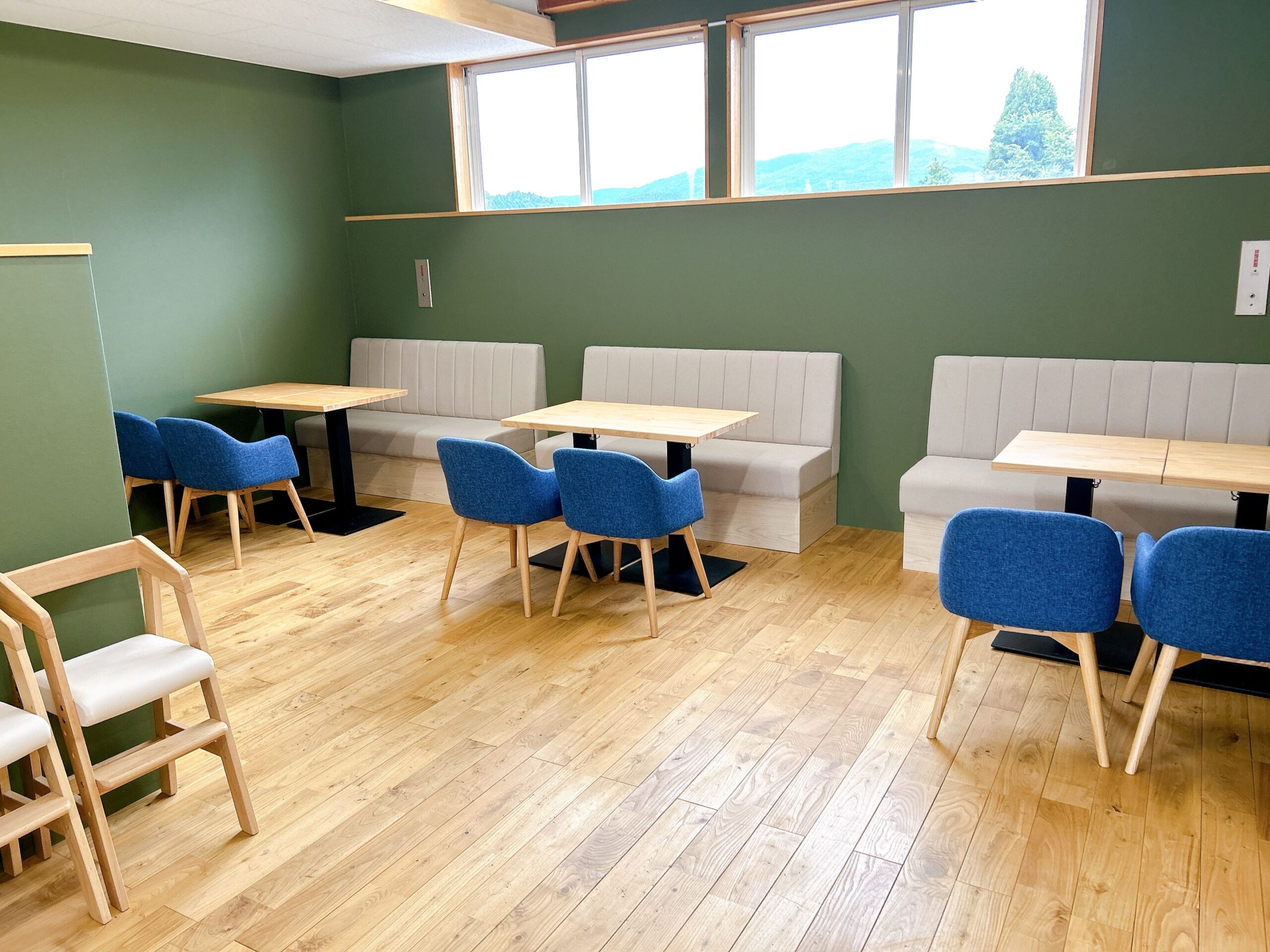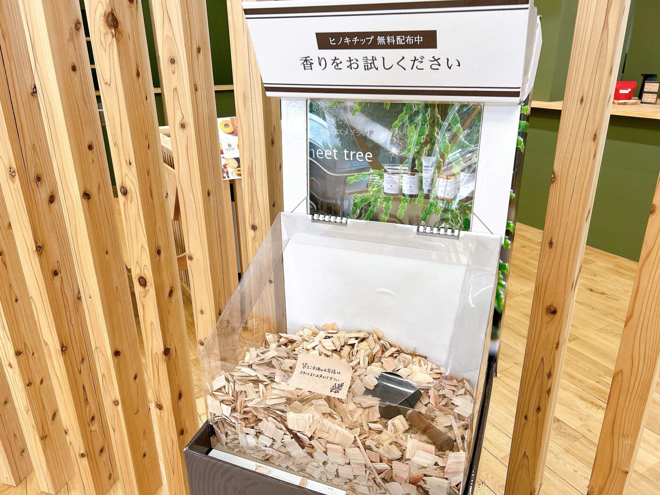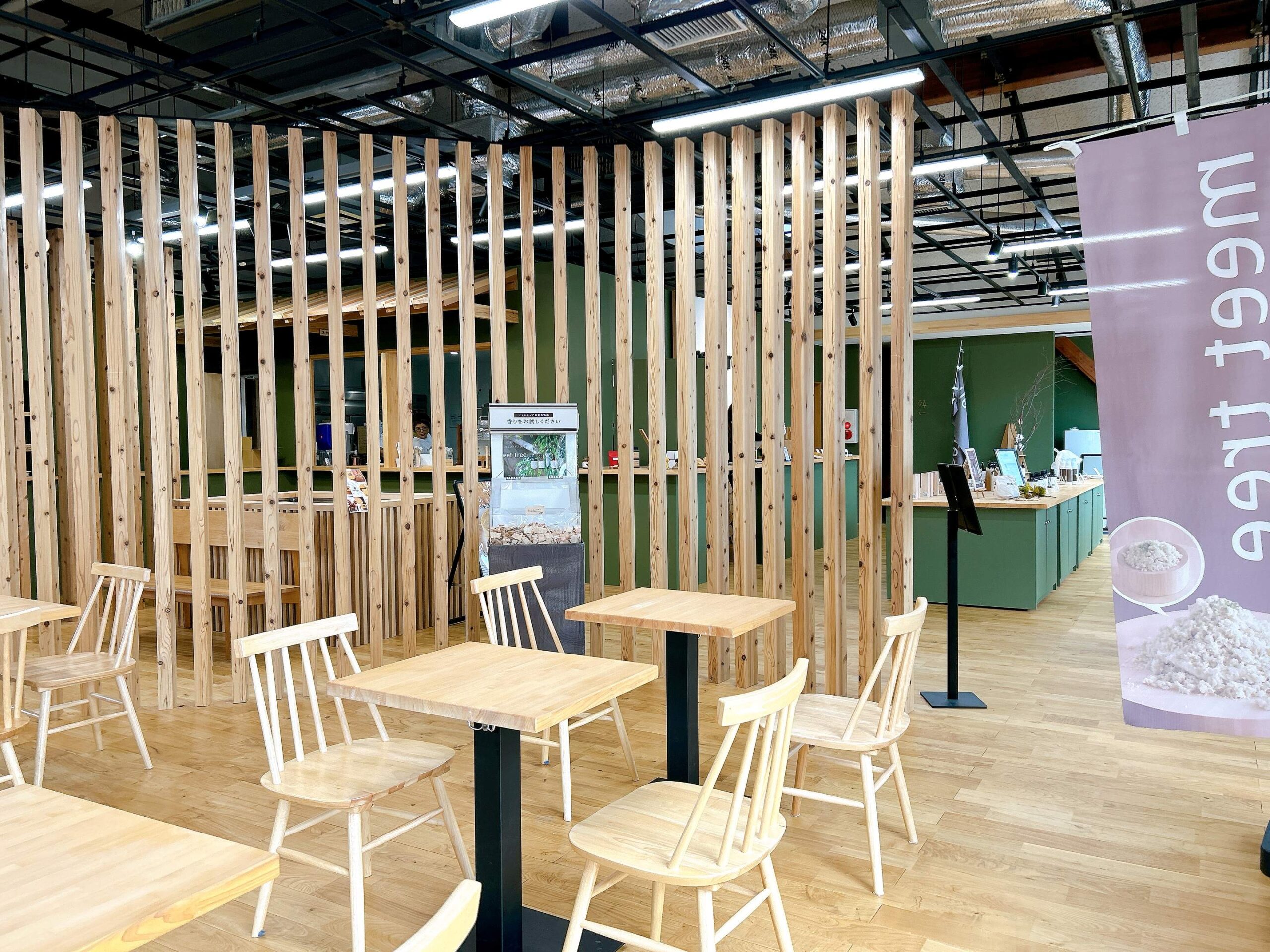 グリーンの壁に木製のインテリア。香りを楽しむためのヒノキチップもあり、森林浴でもしているような気分になれそうです。