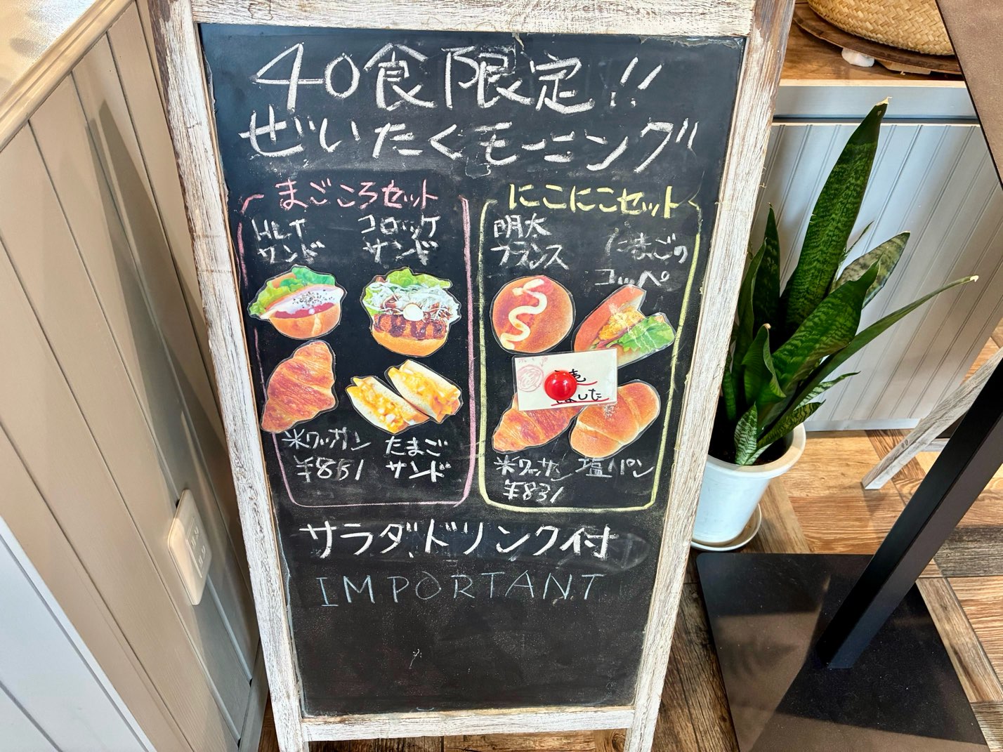 イートインスペースで食べられる40食限定のぜいたくモーニングセット。4種類のパンとサラダ、ドリンク付きでボリューム満点! 私が訪れた際にはニコニコセットは売り切れ(泣)まごころセットをいただきました♡