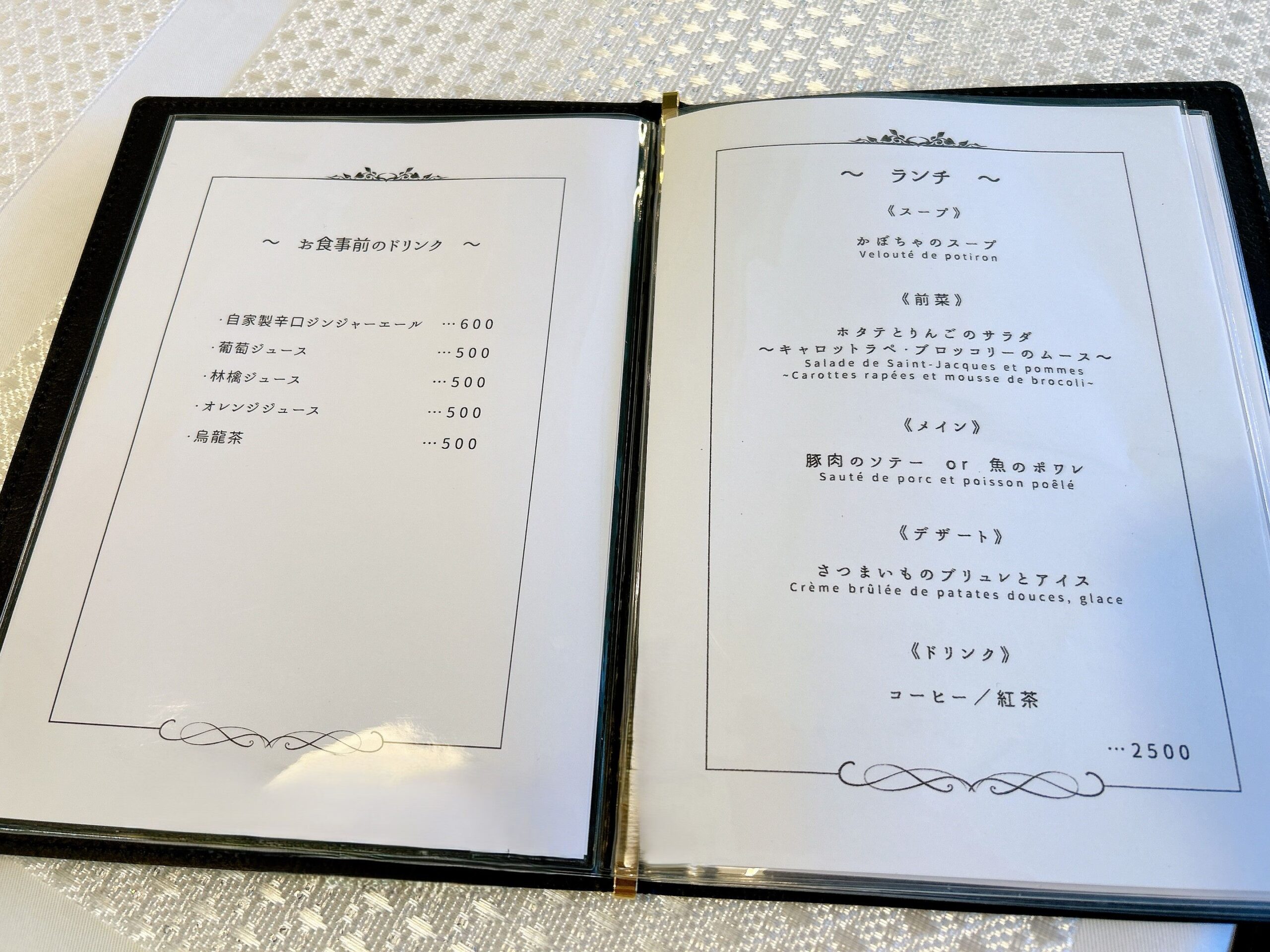 ランチメニューはフレンチのコース料理と別オーダーの食前ドリンクのみ