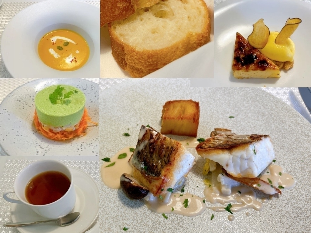 コース料理は、スープ・前菜・メイン・パン・デザート・食後のドリンク