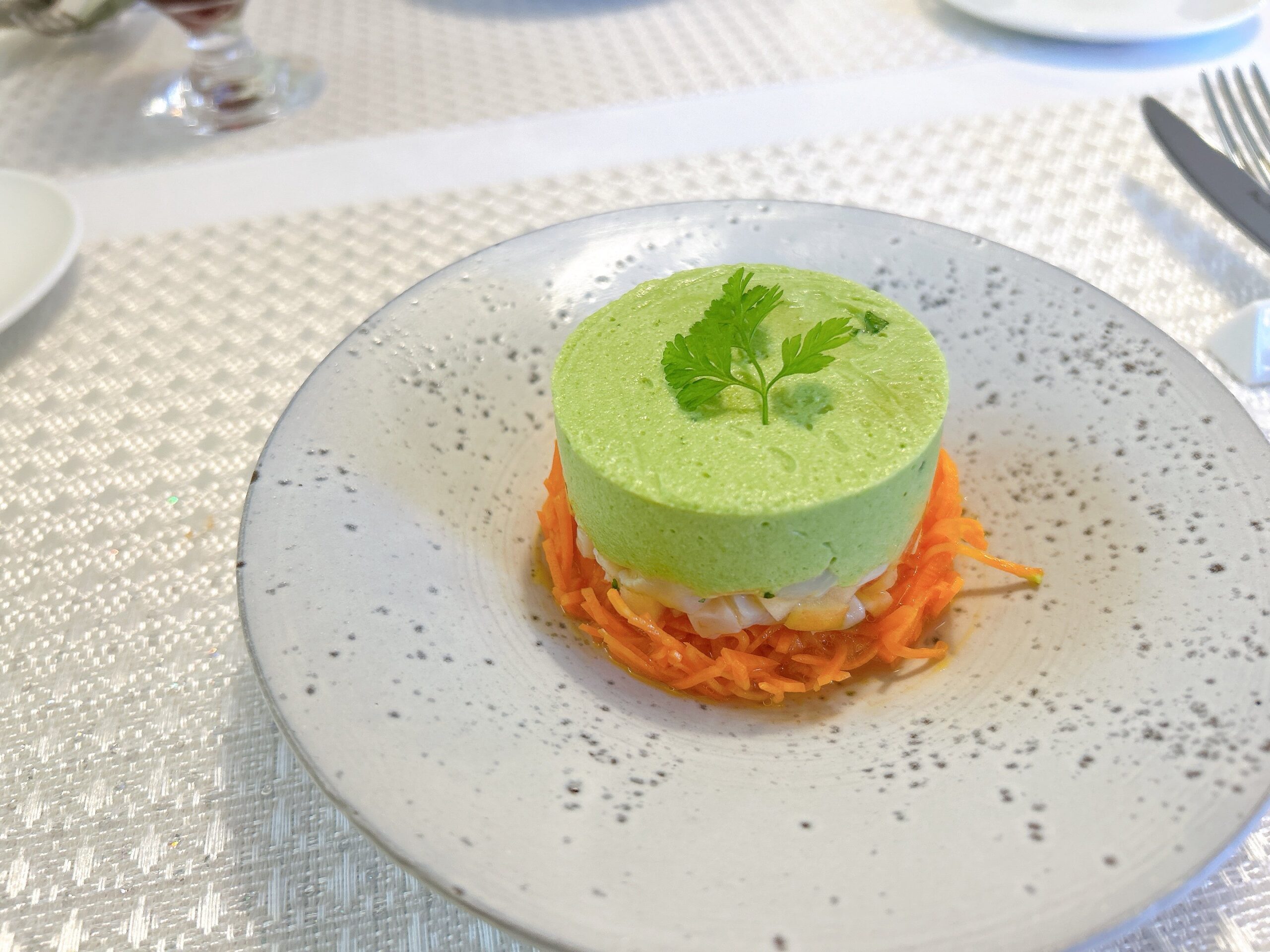 なめらかなムース、シャキシャキとした食感といっしょにふわっとりんごの風味を感じるタルタル、やさしい味のキャロットラペ。