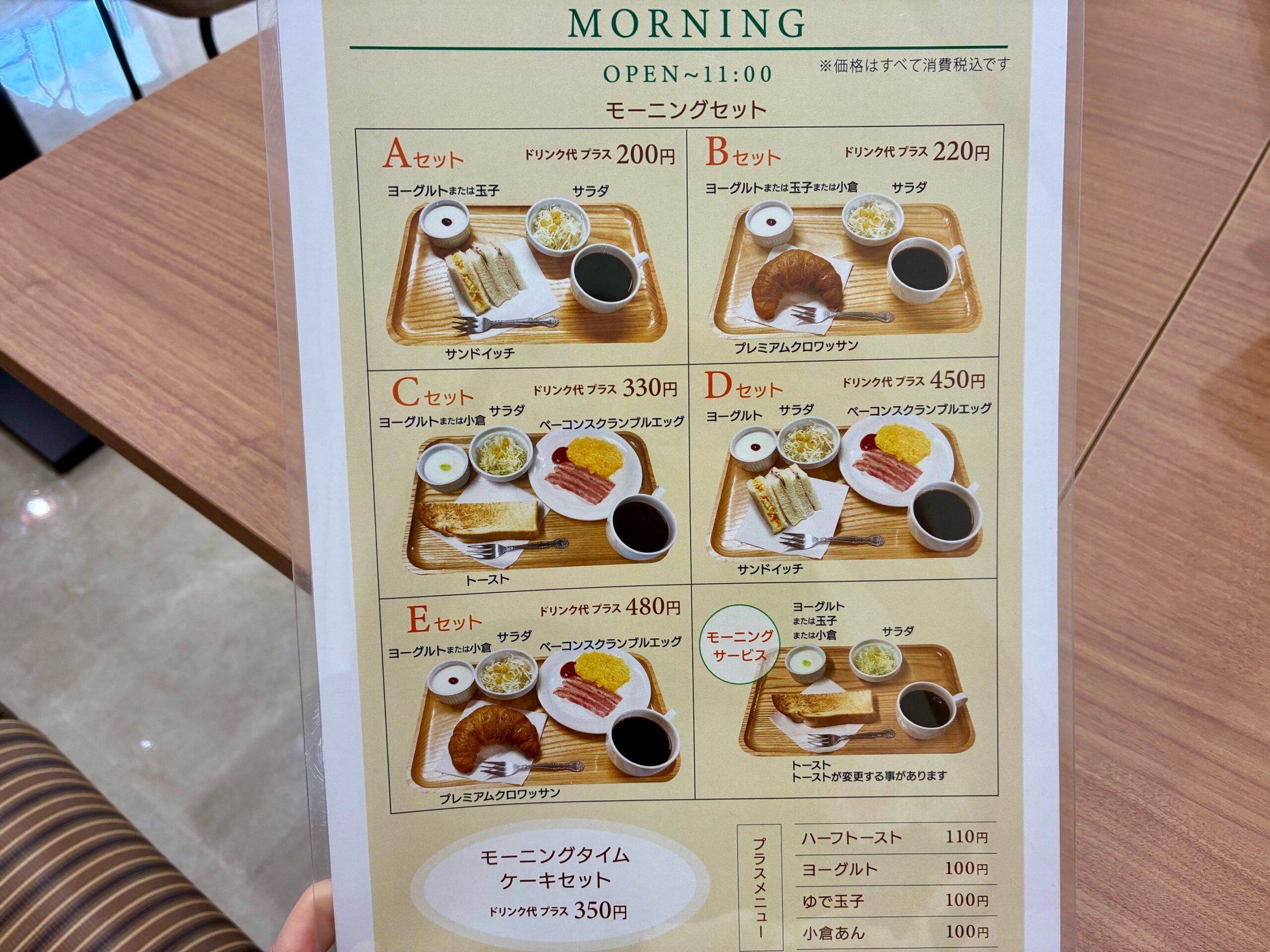 ドリンク代のみで楽しめる定番のモーニングサービスに加えて、プラス料金で選べるセットメニューが 全部で5種類 あり、どれにしようか悩んでしまうほど魅力的です。