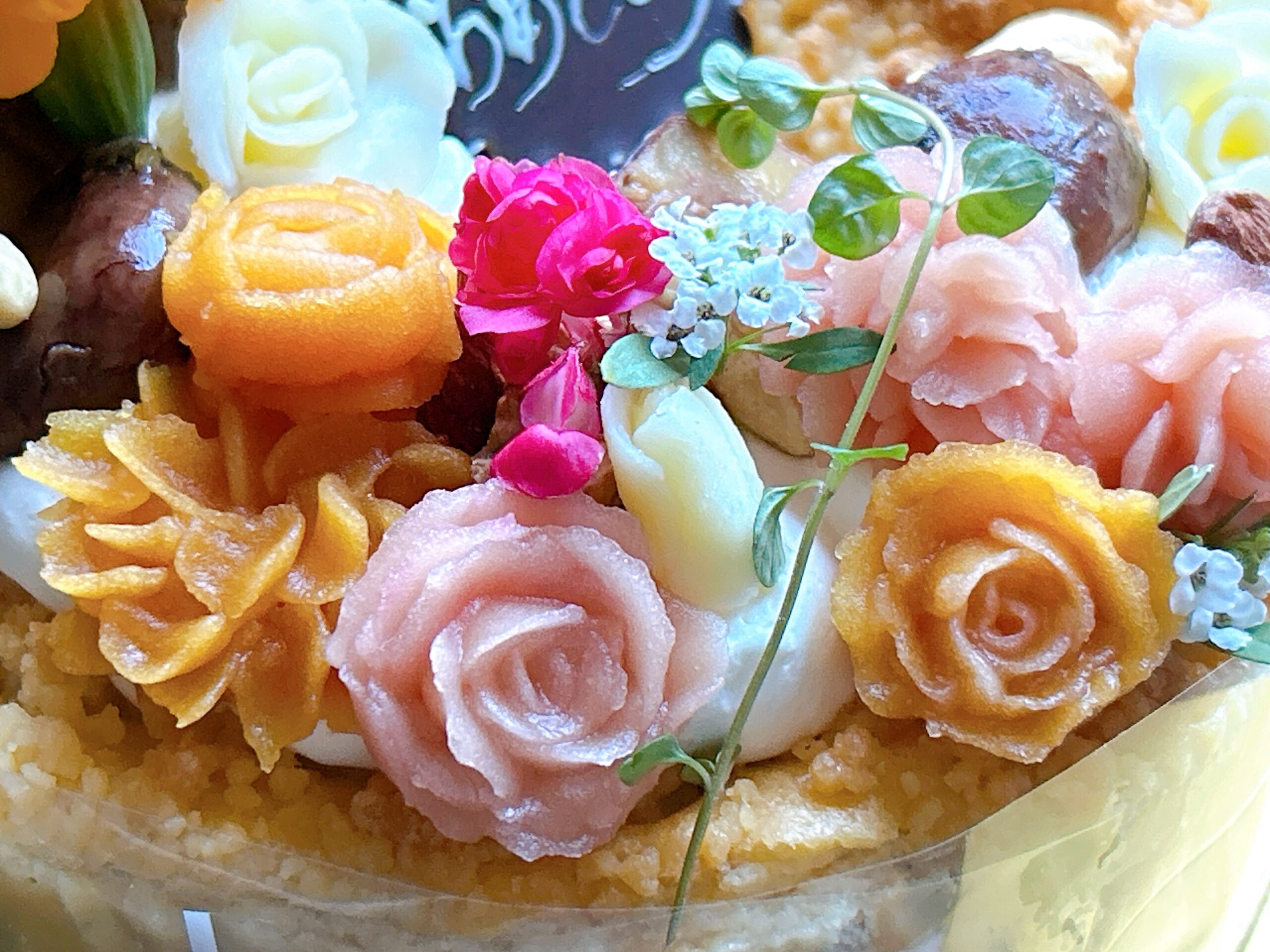 あんことホワイトチョコレートで作られた花がやさしい印象を、差し色のように添えられた鮮やかなエディブルフラワーが華やかな印象をあたえてくれます。
