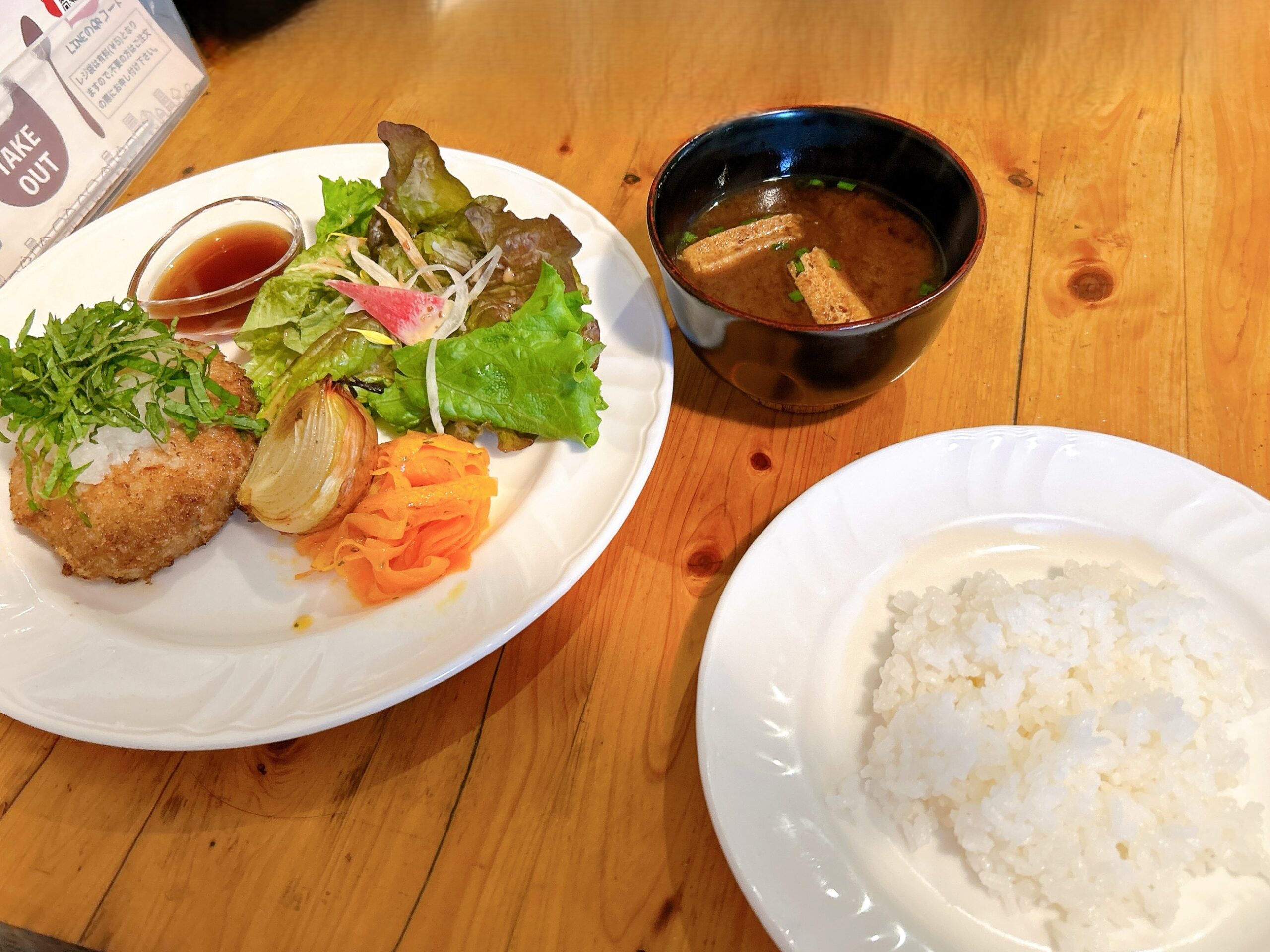 ランチタイムはセットメニューにもメインになる単品メニューにも、サラダ・赤だし・ライスか自家製パンがセットになっています。ライスの量が特大から小まで選べるのもうれしいですね。