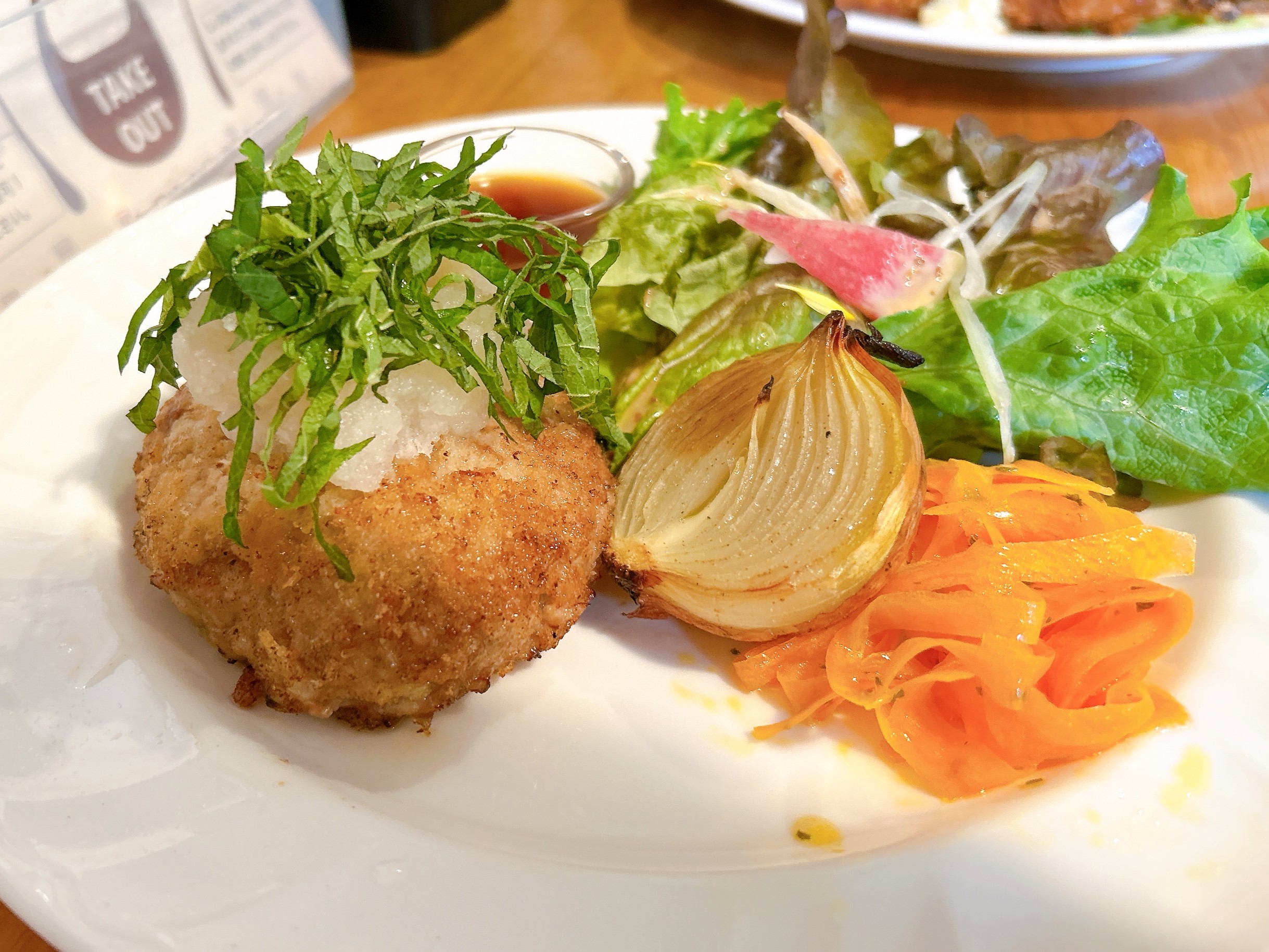 こちらはサラダとハンバーグでワンプレート。グラタンは別プレートですが、セットのグラタンとサイズも味も同じもののようです。