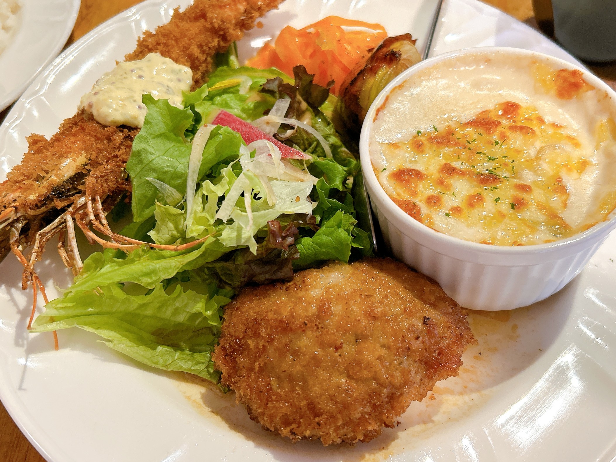 ワンプレートに、焦がしハンバーグ・有頭海老フライ・サラダ・期間限定のグラタン…。いろんな味を楽しみたい方にぴったりのメニューですね。