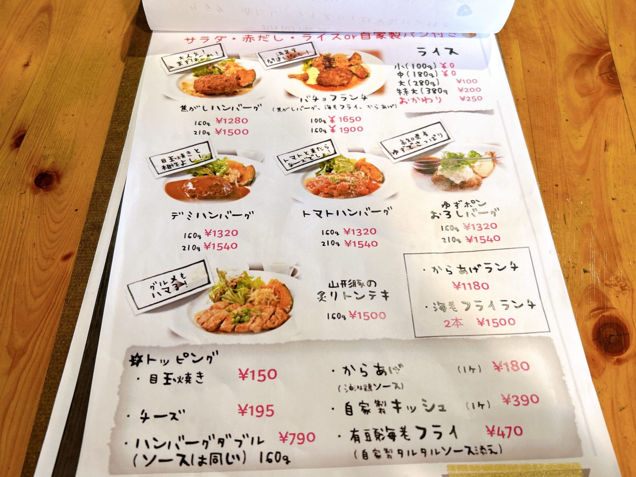 看板メニューの焦がしハンバーグはもちろん、トマトやデミ、ゆずポンおろし…どれも美味しそう。