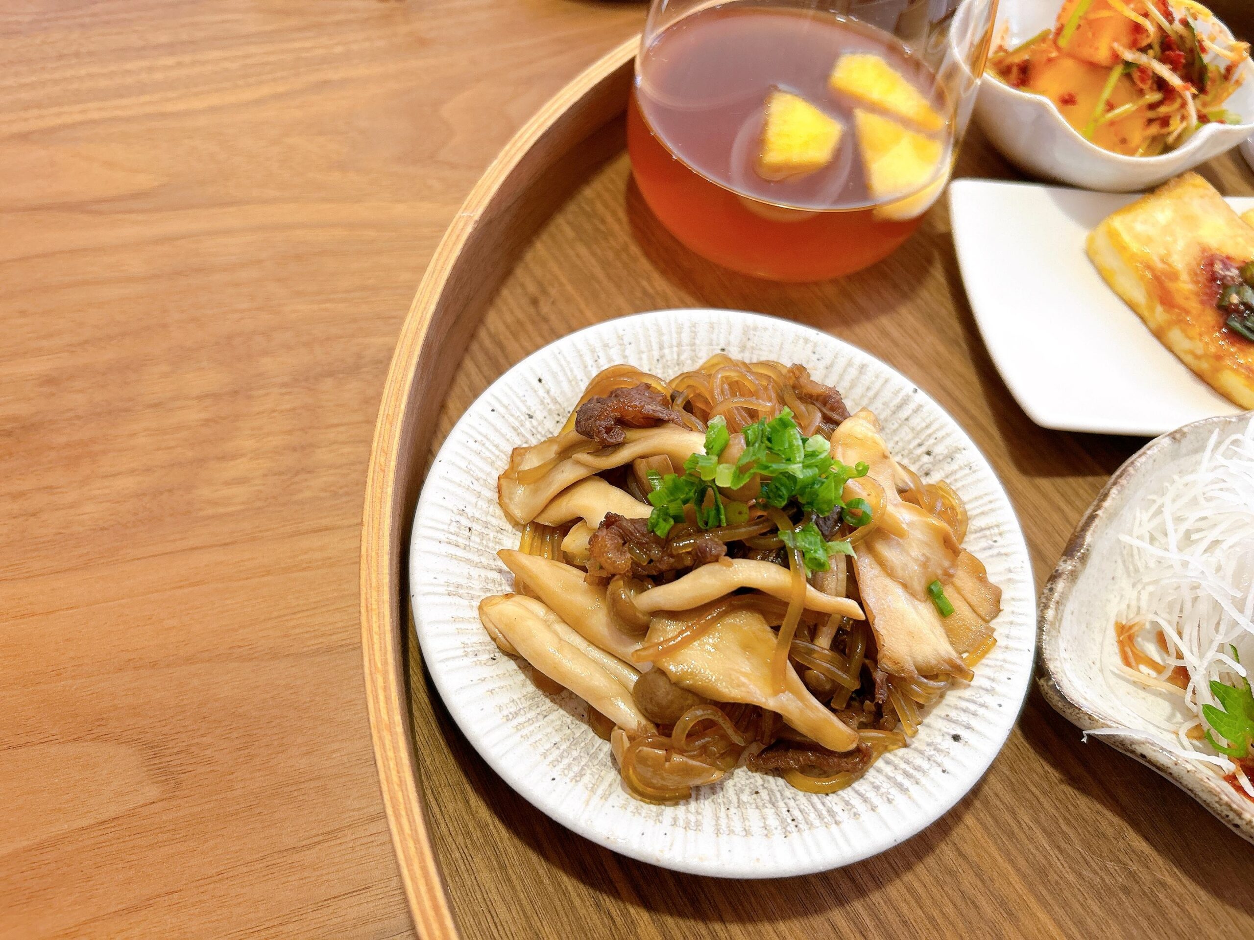 唐辛子系の味付けが多いなか、韓国春雨ときのこが甘辛く味付けされているきのこのチャプチェ。