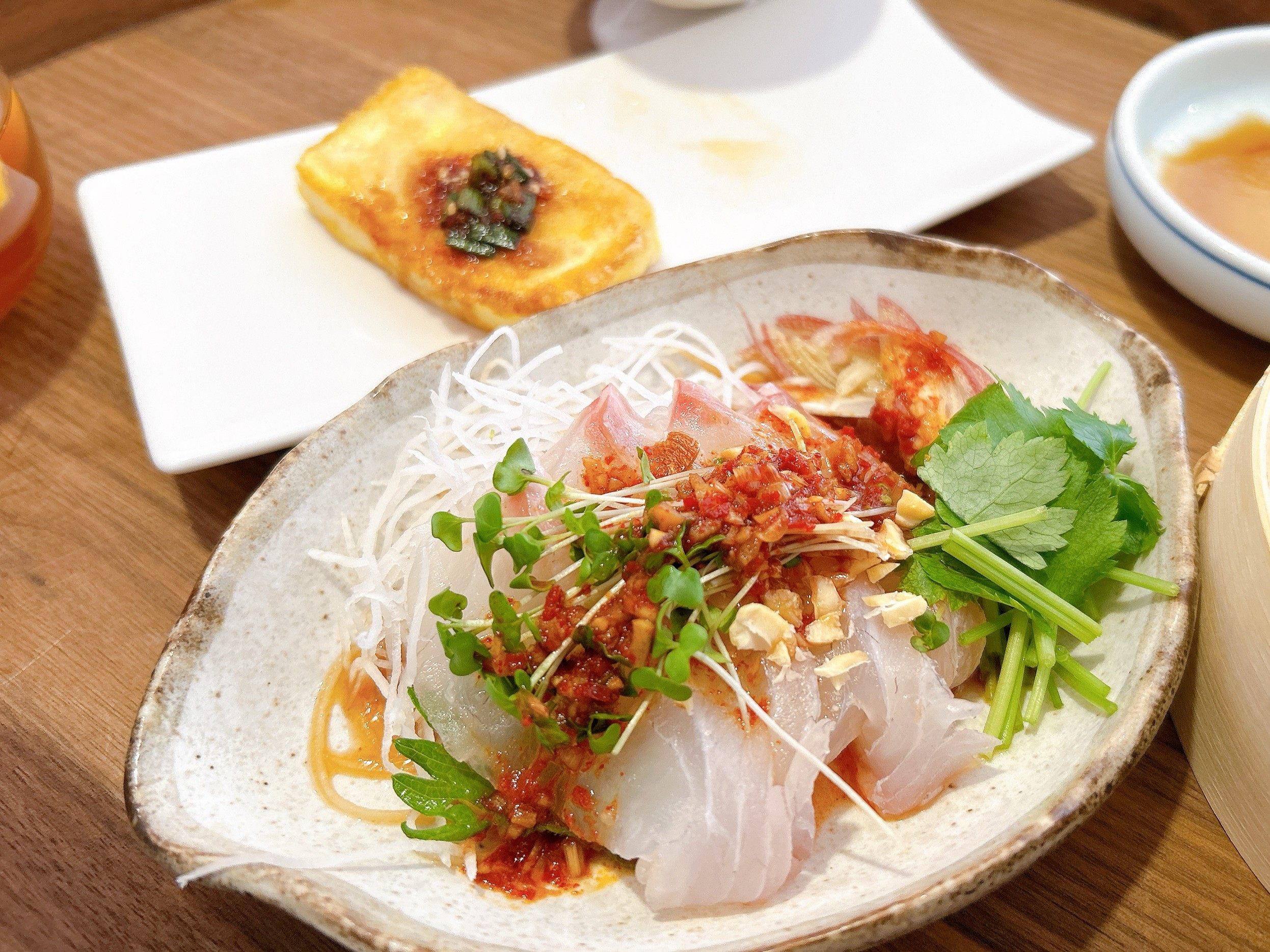 鯛とナッツの韓国さしみは、ほんのり辛味のあるソースに、ミョウガやみつばの風味、ナッツの食感も加わって、和食でいただくさしみとはひと味違う感じでした。