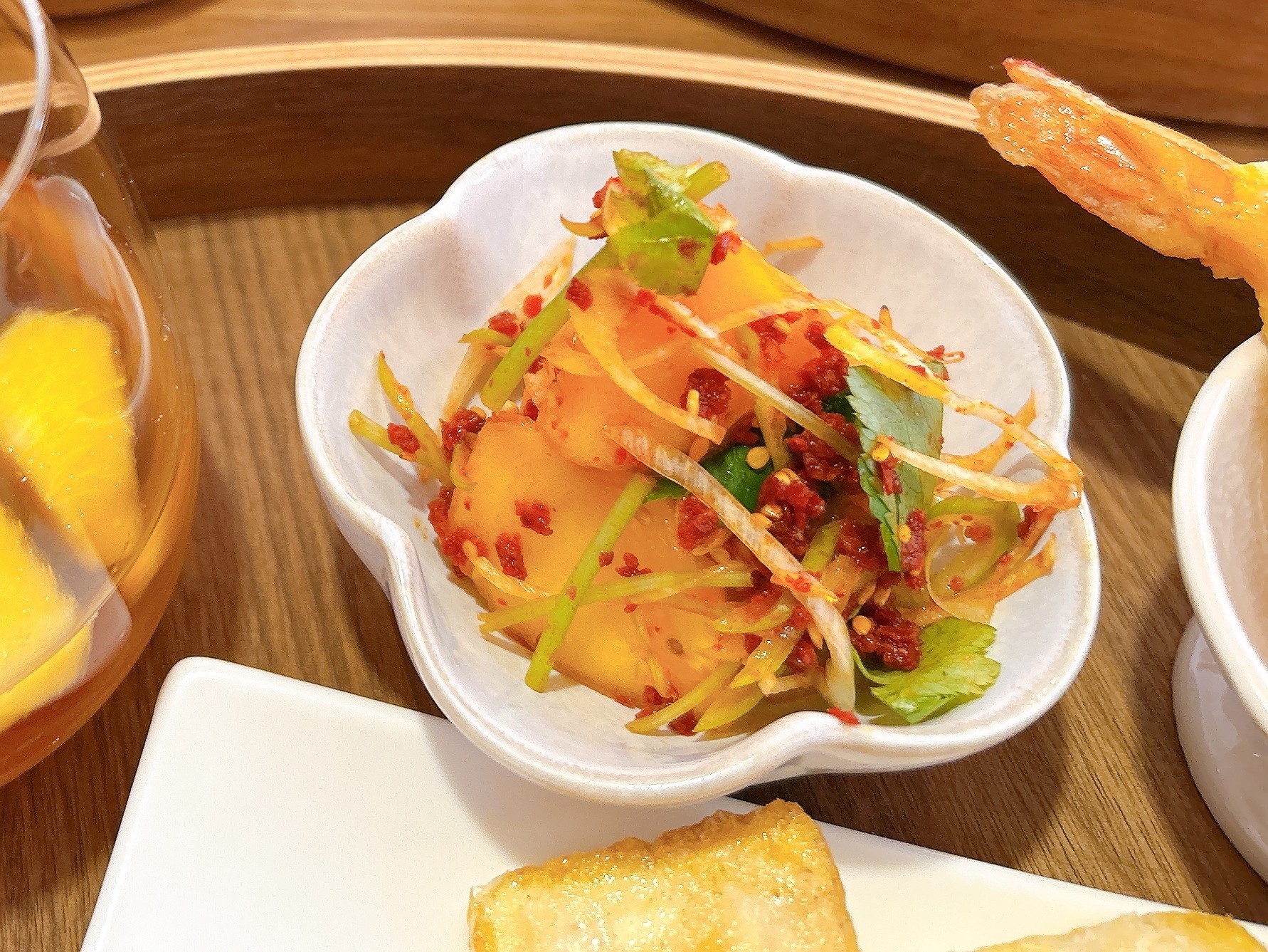 柿のキムチは、少し食感が残っている程度のやわらかさで、辛味はあるものの、じゅわっと柿のエキスが口に広がるからか、野菜のキムチよりもまろやかに感じました。