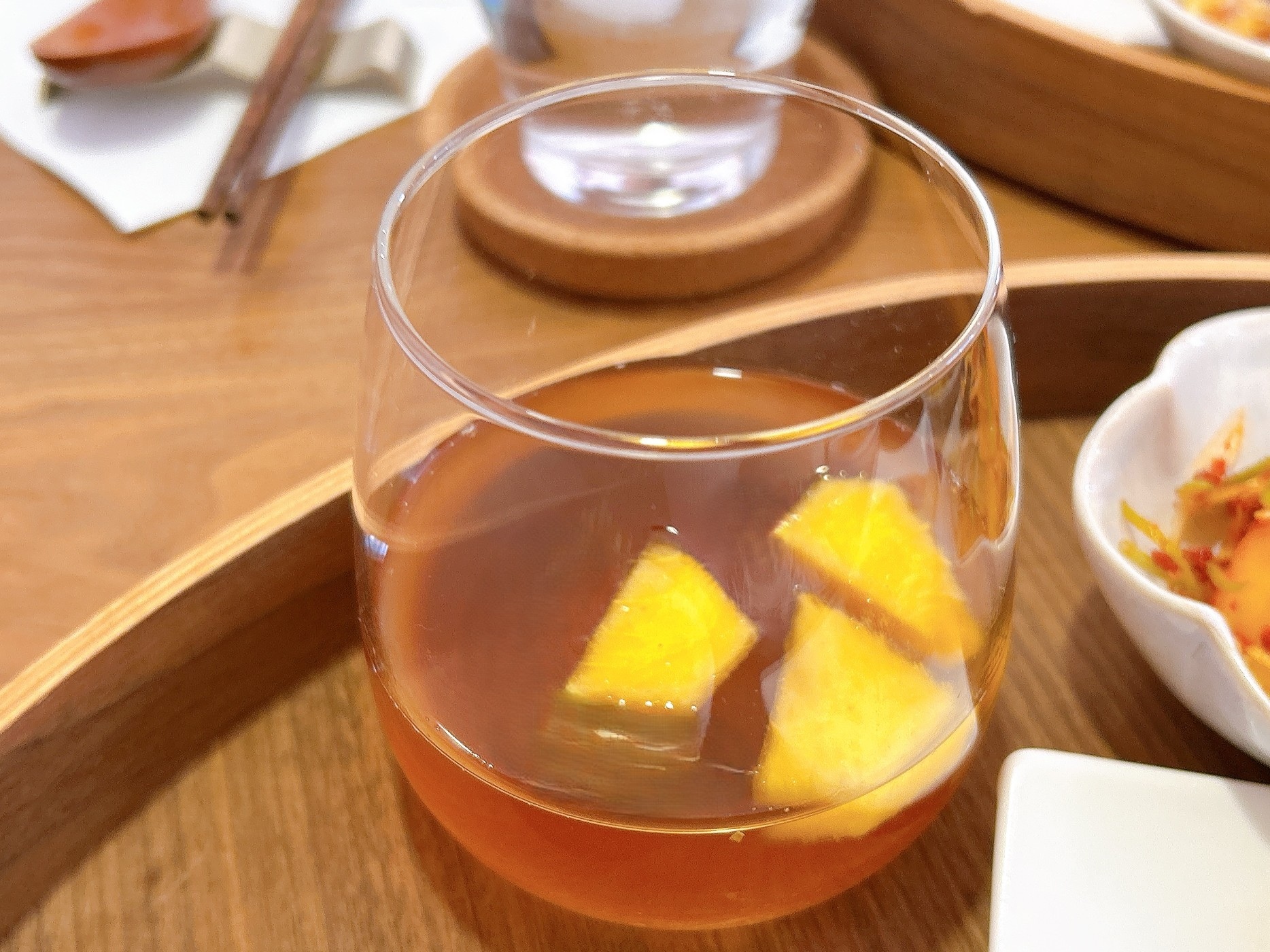スジョンガという生姜とシナモンを煮出したドリンクは、常温でいただいているのに、カラダの内側からぽかぽかしてくるような感じがしました。