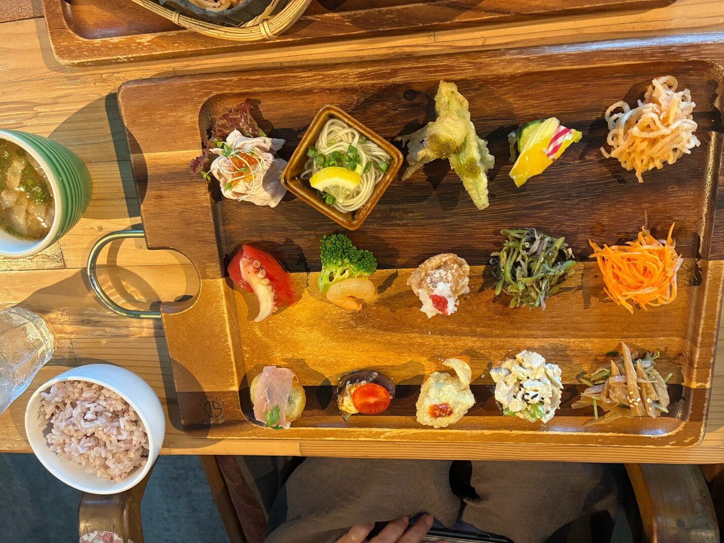 15品のおかずは全てが一口サイズで、揚げ物、サラダ、お肉にお魚まで、ちょっとずつ色んな味を楽しめる贅沢なプレートです。