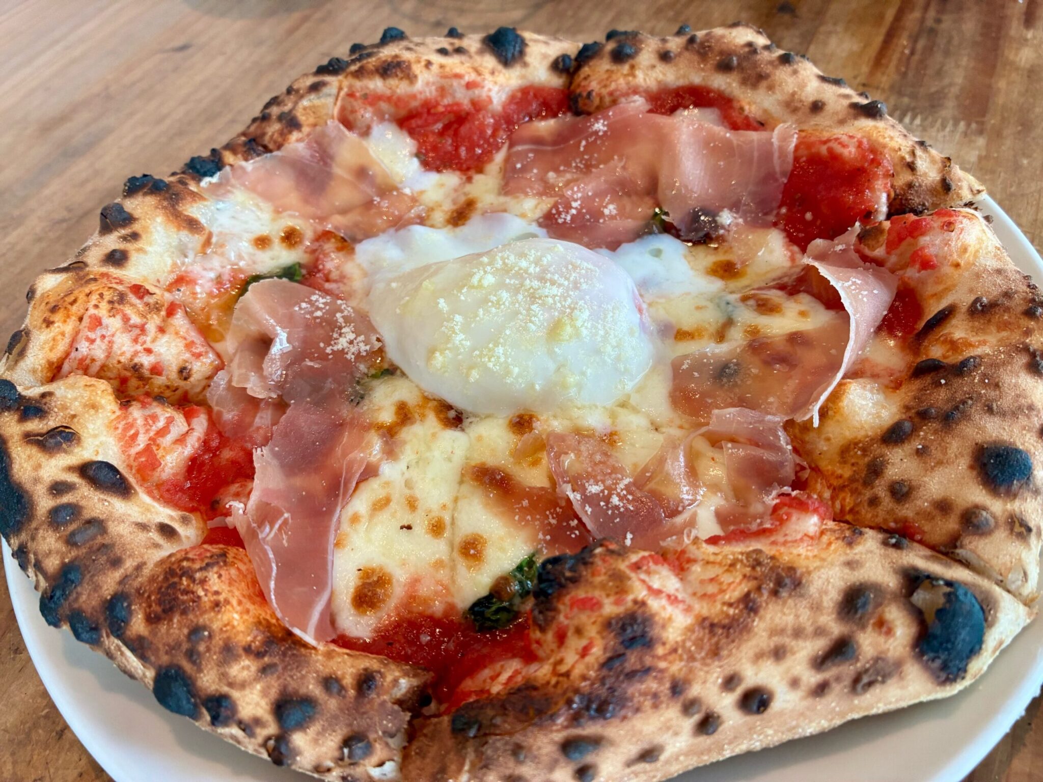 真ん中にはとろ〜り半熟の卵がのっています!ナイフを入れると黄身がとろっと広がり、チーズや具材と混ざり合って絶品!