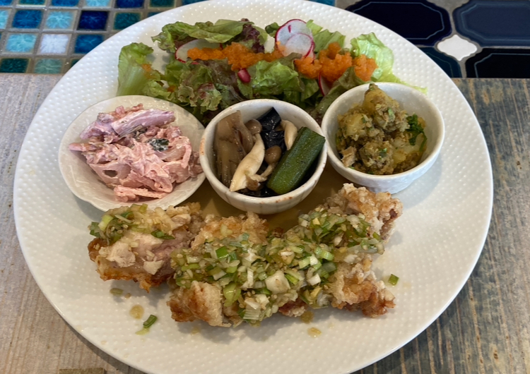 カリッカリに揚がった薬味たっぷり油淋鶏、すりおろし人参がガッツリ載ったサラダ、味わい濃厚な冷製コーンスープ、雑穀米が付いています。1品ずつにお野菜しっかり。ヘルシーかつボリューミーなランチです!