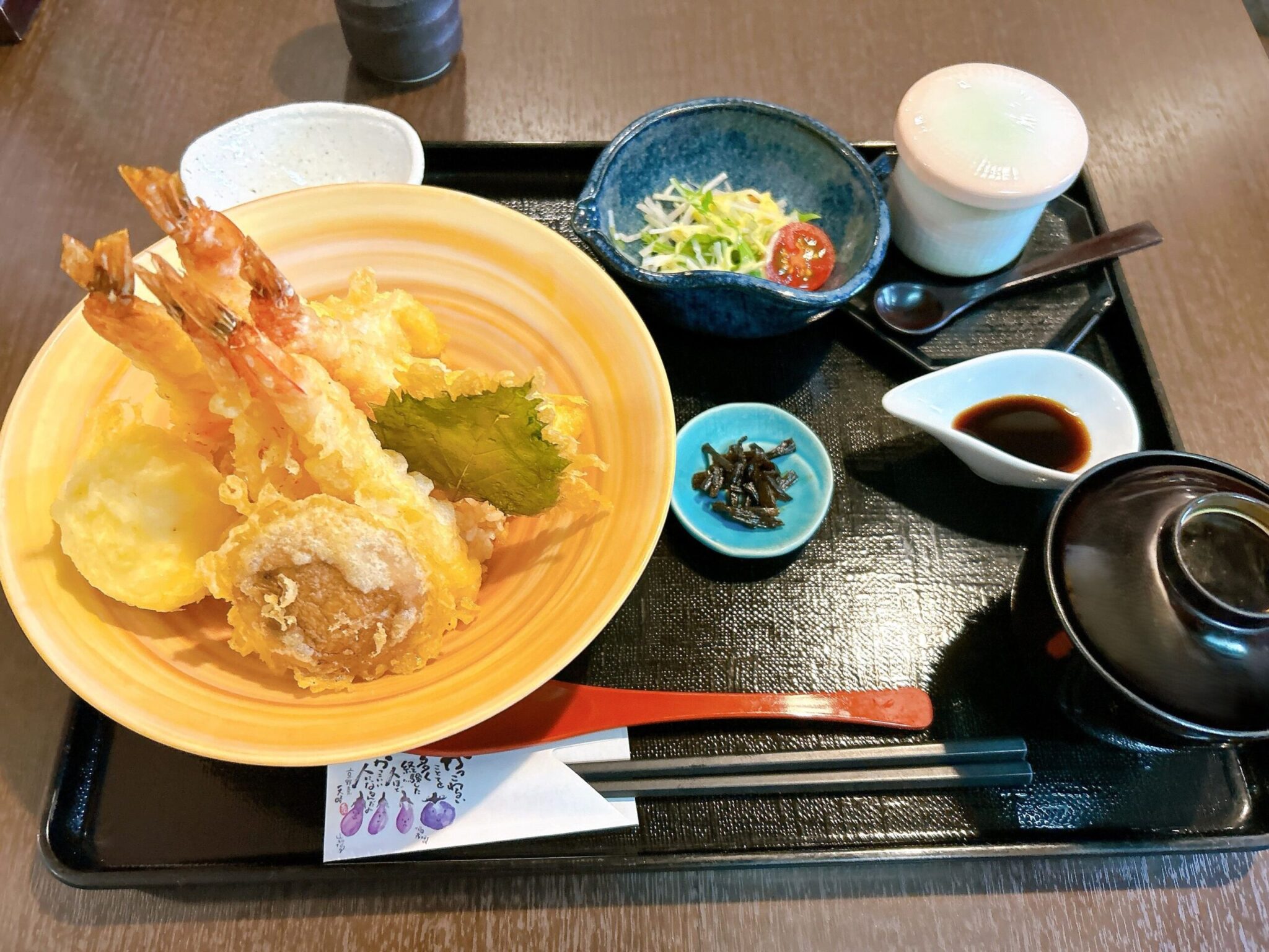 セットには天丼、味噌汁、茶碗蒸し、きゃらぶき、サラダが付いています。