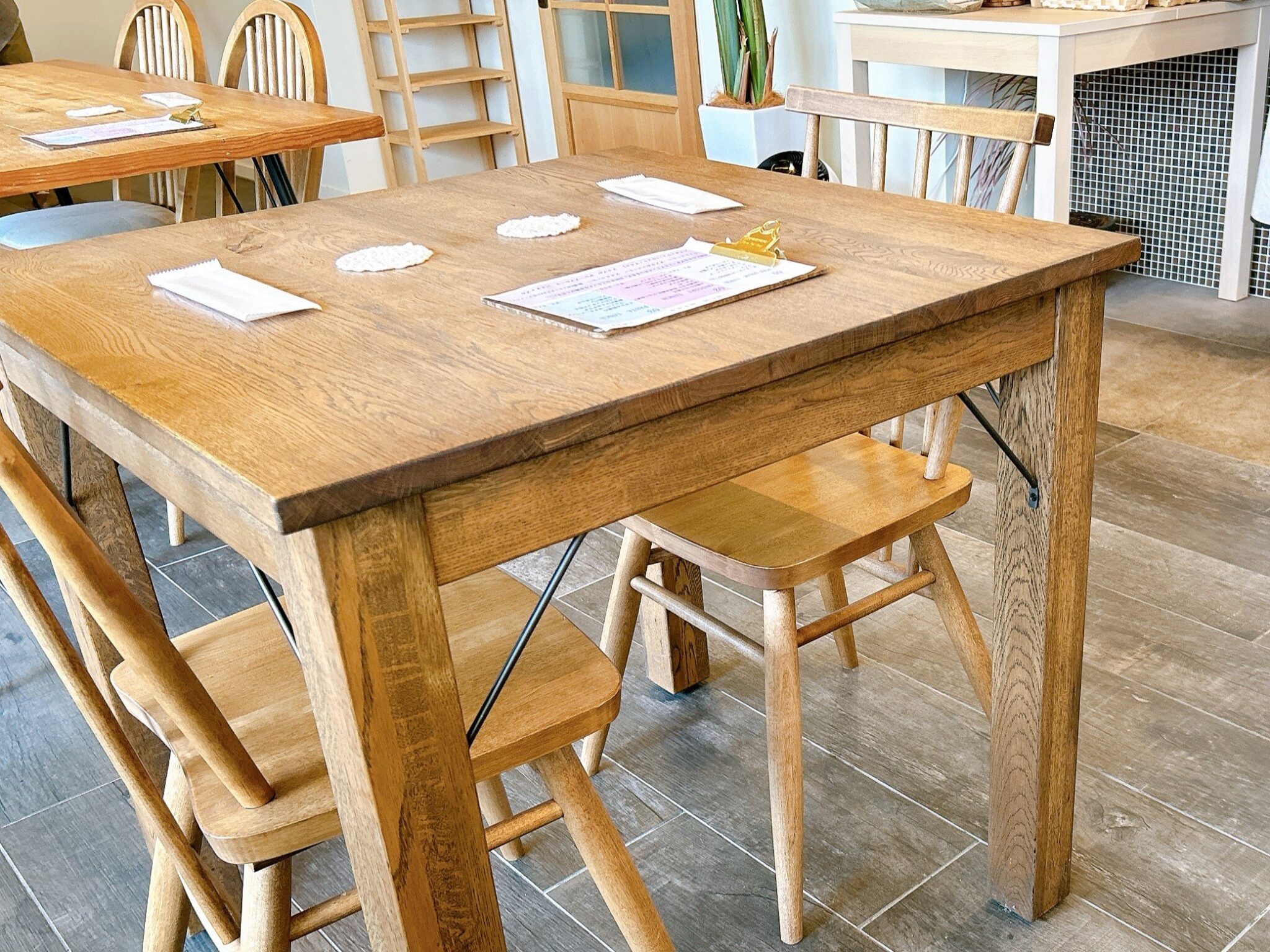 落ち着いたトーンのインテリアで、木の温もりを感じるテーブルや椅子。