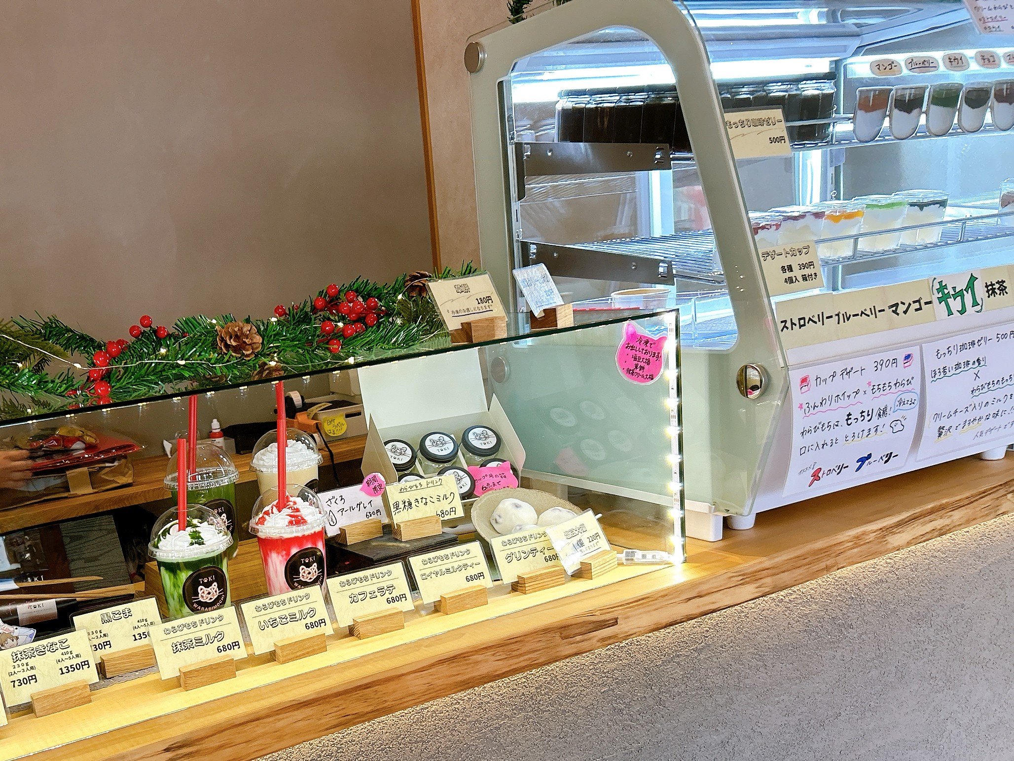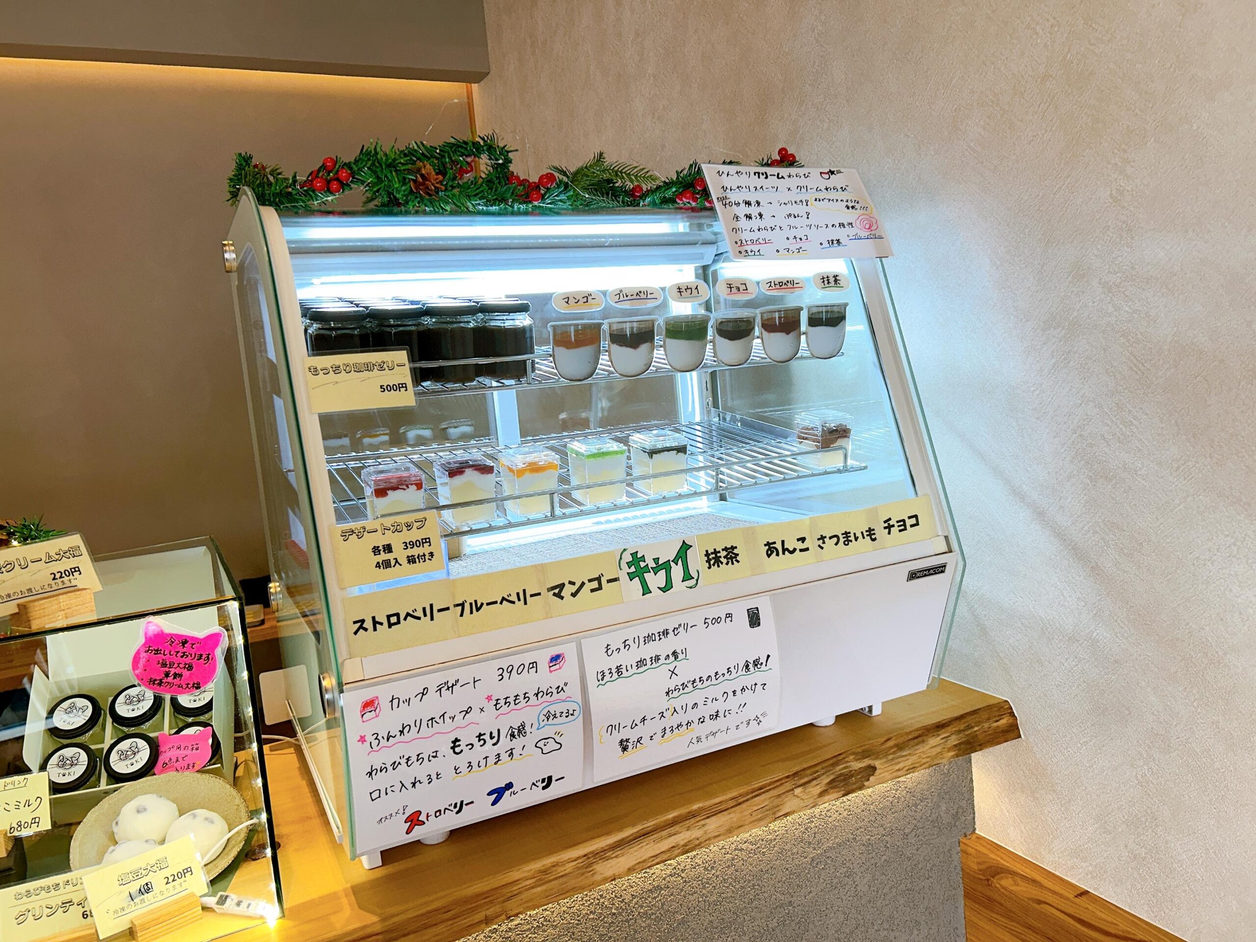 わらびもちと聞いて想像する定番のものから大福など普段あまり目にしないようなものまで、さまざまな商品があり、ショーケースには保冷が必要なカップデザートなどが並んでいます。