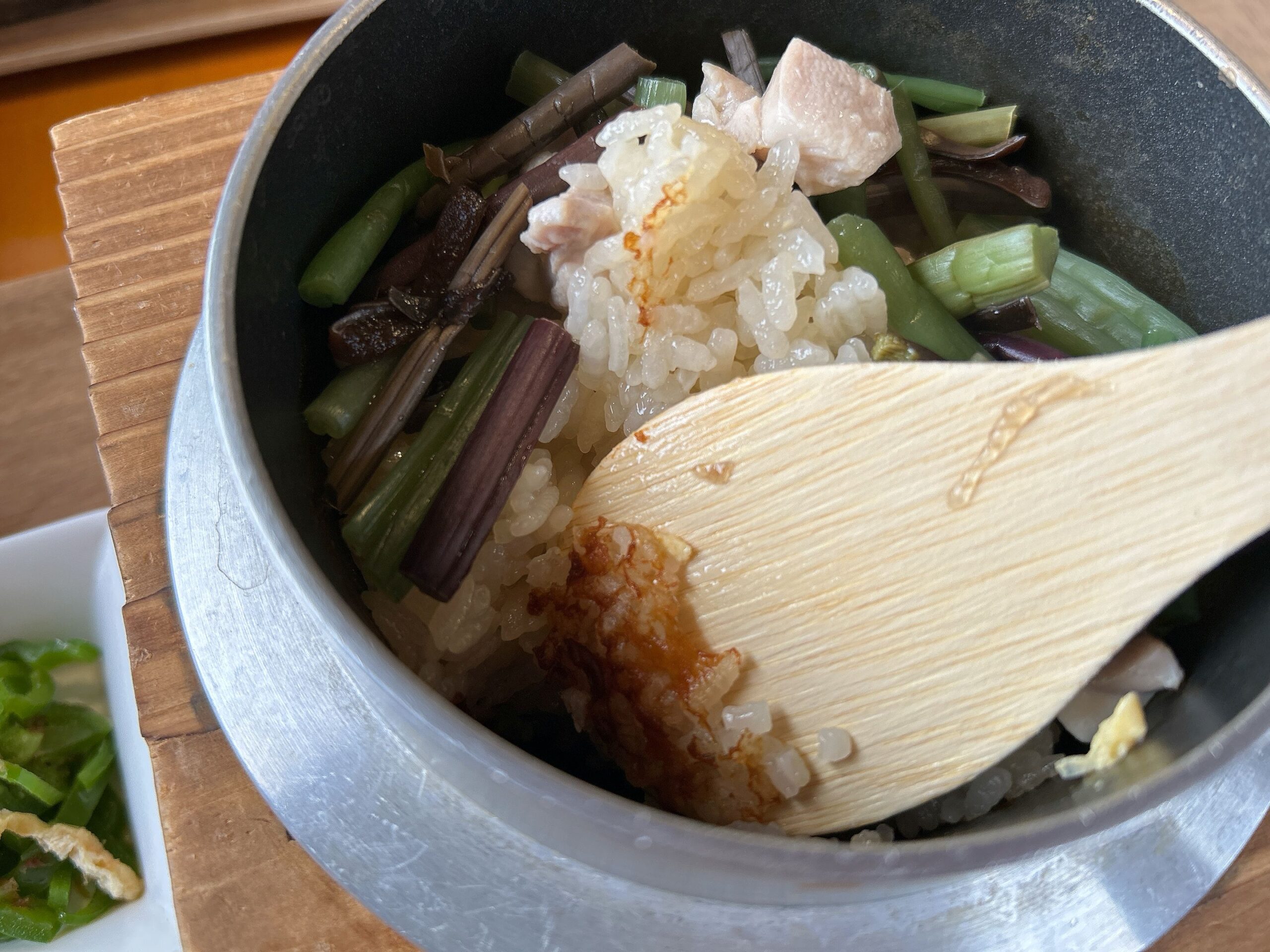 具材は鶏肉と山菜。釜めしの醍醐味、おこげを見つけたときは、ちょっとうれしくなりました。