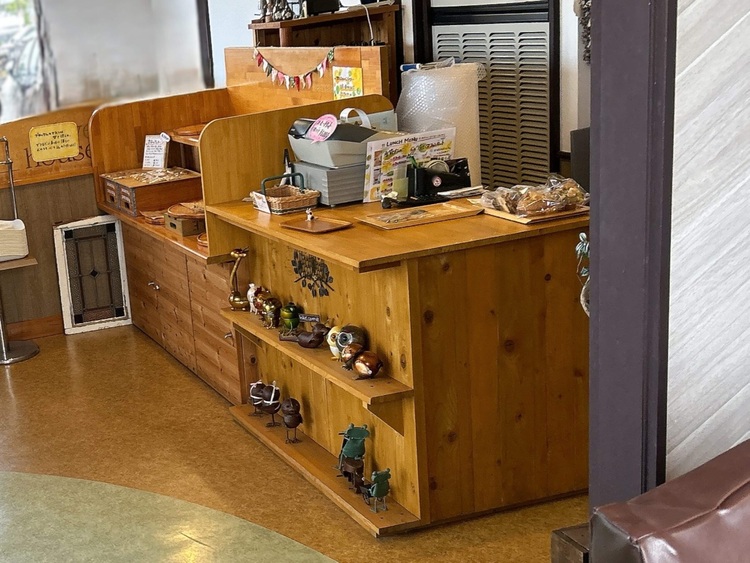 入口正面にはレジカウンターがあり、右手はソファー席、左手はテーブル席や窓に面したカウンター席が広がっています。