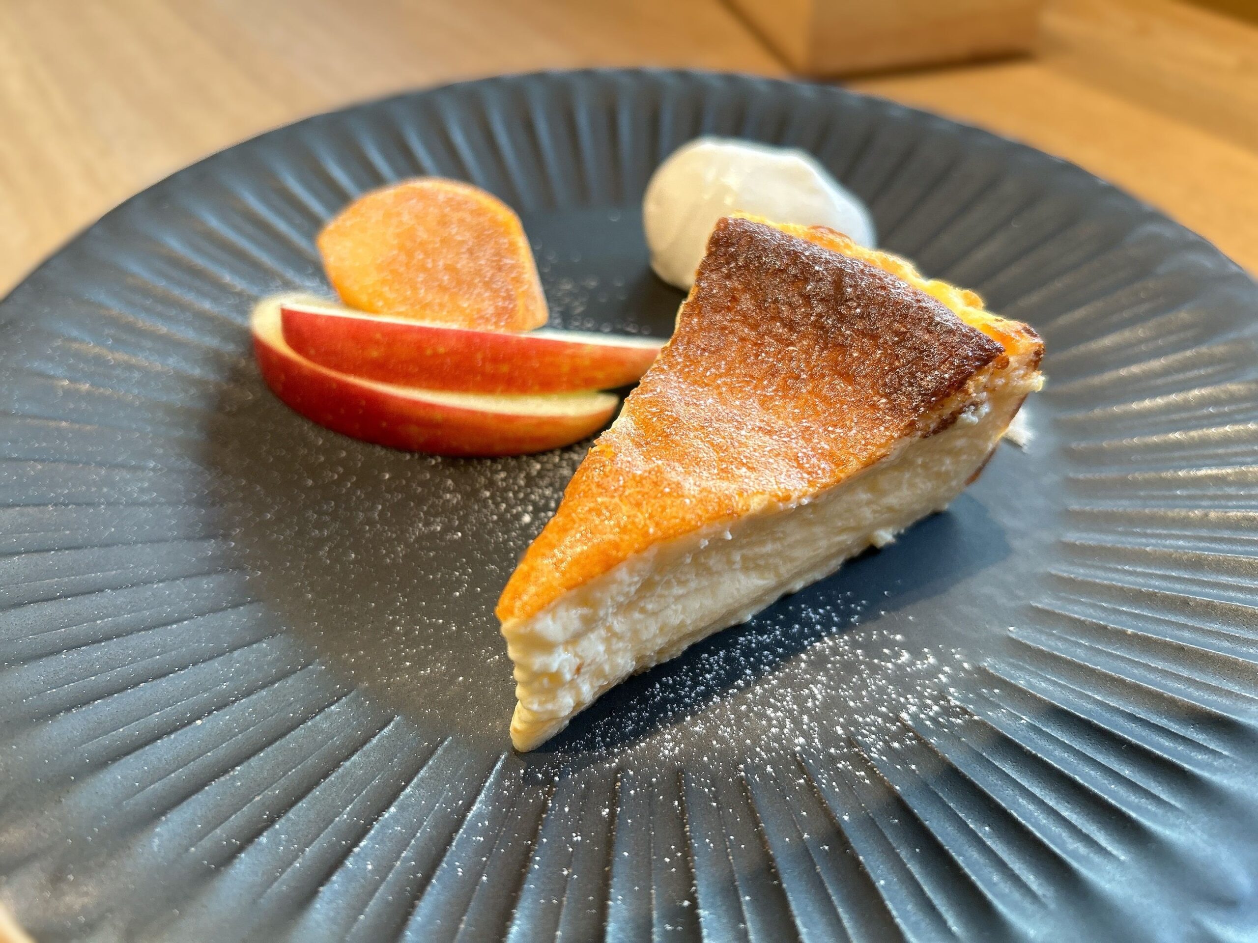 プレートにはバスクチーズケーキだけでなく、季節のフルーツとクリームが。いっしょにいただくと、チーズケーキだけでいただくのとはまた違った味わいがあります。