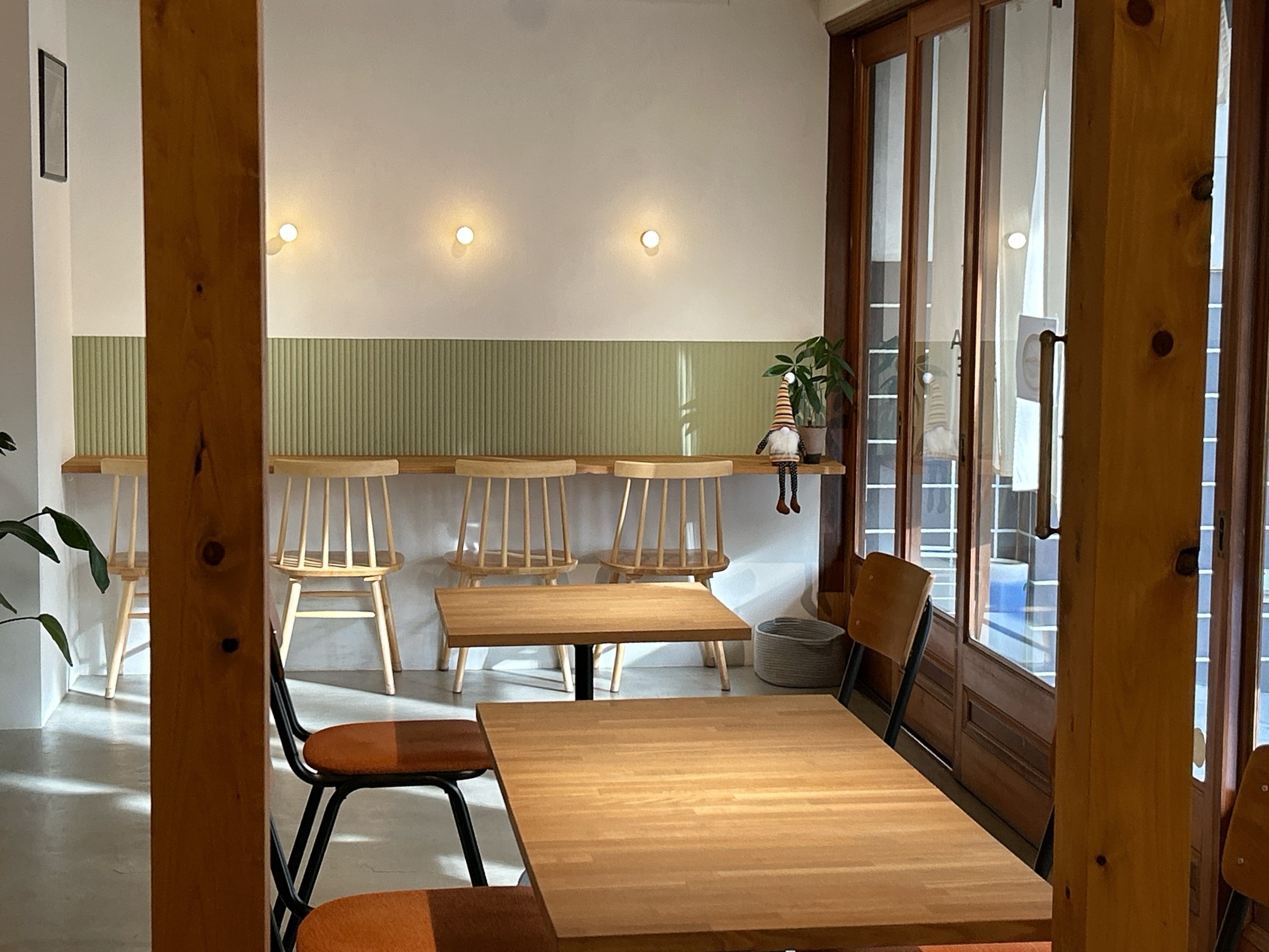 右手は、カウンター席。白壁に畳を思わせるようなグリーンのアクセントに癒され、なんだかほっとした気持ちになります。