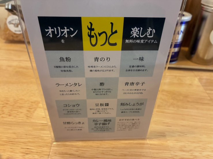 ガッツリとした食べ応えがありながらも、重すぎず最後まで美味しく楽しめる「orion 多治見店」の一杯。お洒落で入りやすい店構えや、明るく清潔感のある店内は、これまで二郎系にハードルを感じていた方にもぴったりです。さらに豊富な無料味変アイテムによって、自分好みにカスタマイズできる楽しさも魅力のひとつ。ラーメンのクオリティはもちろん、空間やサービス面でも満足度の高い一軒で、地元・多治見に誕生した注目店として、今後ますます話題になりそうです。