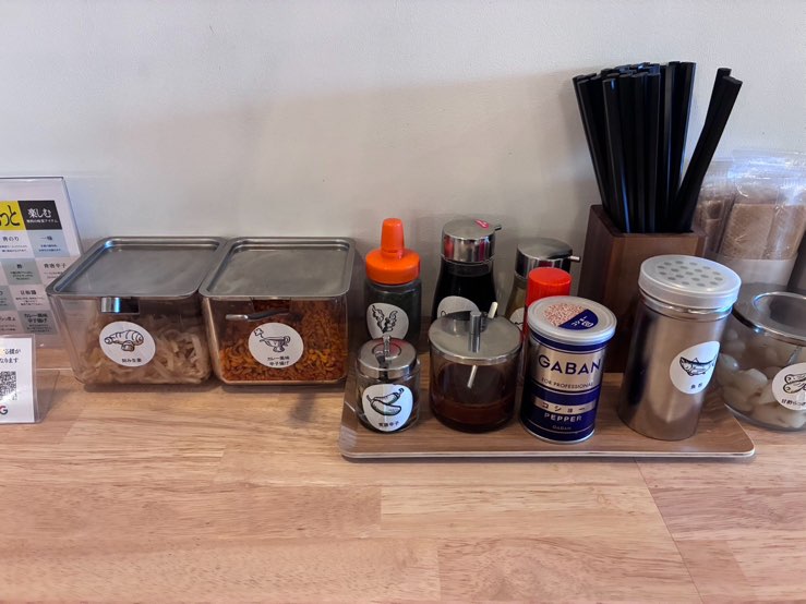 胡椒・一味・青のり・酢・豆板醬・青唐辛子・甘酢らっきょ・刻み生姜・カレー風味辛子揚げ・ラーメンタレが各テーブルに置かれています。