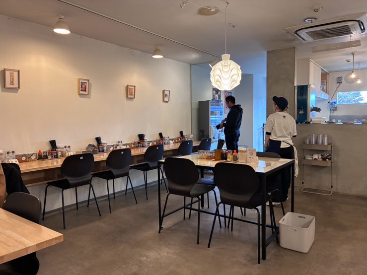 マンションの1階にあるお店の外観はグレーの壁に黄色いロゴが映えるスタイリッシュなデザイン。ラーメン店というよりお洒落なカフェのような佇まいで、女性でも気軽に入りやすい雰囲気です。