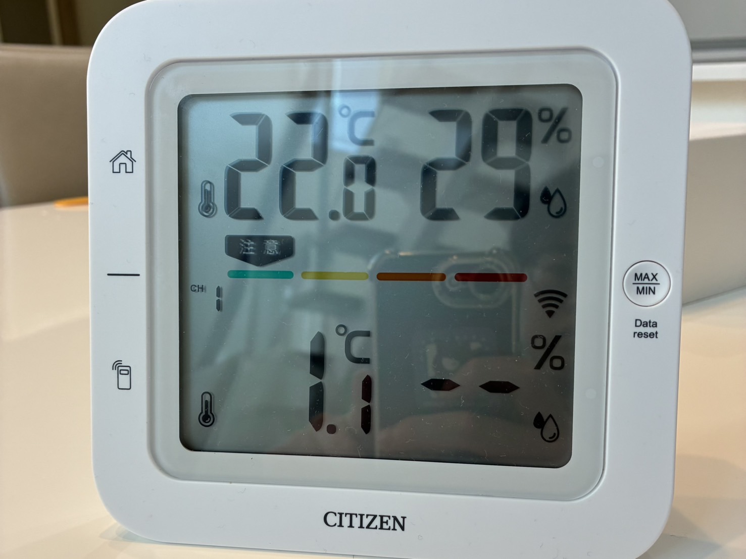 そして翌朝、さらにその凄さを実感します。温度計を確認すると、外の気温は1.1度。かなり冷え込んだ朝でした。しかし、室内は約22度をキープしており、寒さを一切感じることなく起きることができました。通常であれば、冬の朝は布団から出るのが億劫になりますが、この家ではそのストレスがまったくありません。起きた瞬間から暖かく、リビングに移動しても同じ快適さ。この「朝のストレスがない」という体験は、想像以上に価値があると感じました。